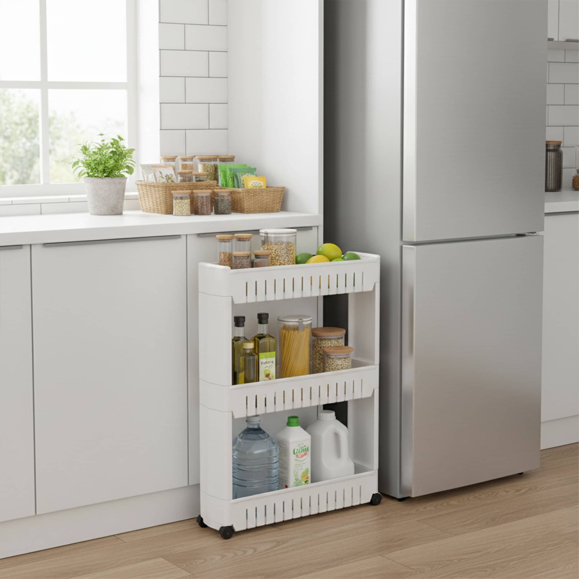 - Maximize Space: 3-tier design, ideal for kitchens, bathrooms, offices; slides into narrow spaces