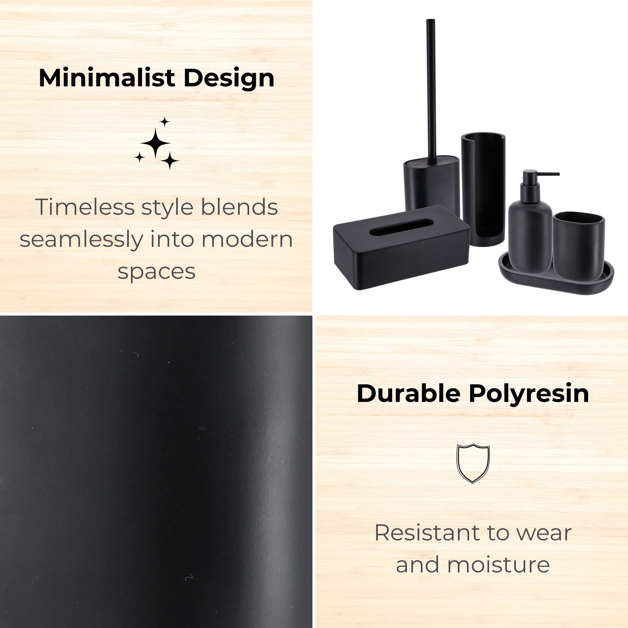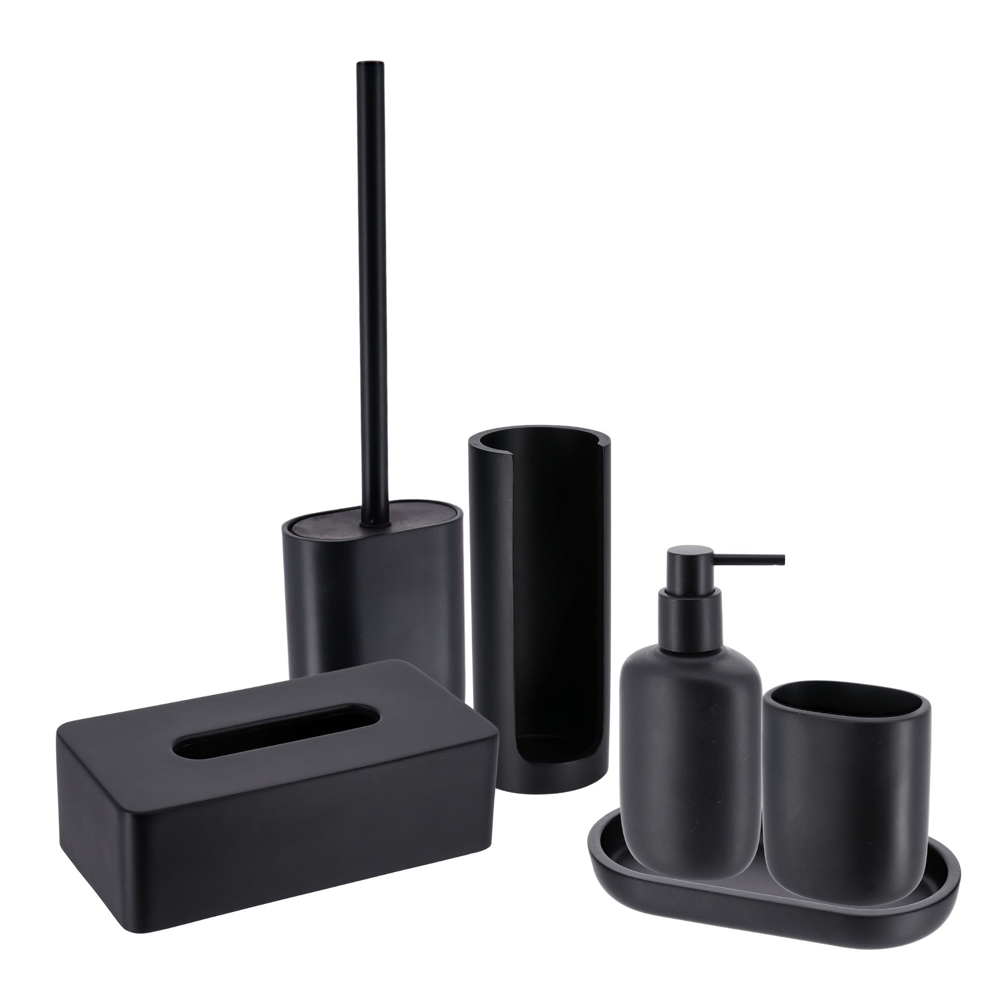 This bathroom essentials set includes a liquid soap dispenser, tumbler, tray, tissue holder, cotton round holder and toilet bowl brush. Moreover, the sleek matte finish highlights a minimalist design that complements both modern and classic house decor. Additionally, durable polyresin construction resists moisture, ensuring long-lasting performance in damp bathroom environments. Then, the compact shapes make bathroom organization easy without overwhelming small vanities or countertops. Furthermore, the coordinated design creates a seamless look across all bathroom decor and accessories for a cohesive upgrade.