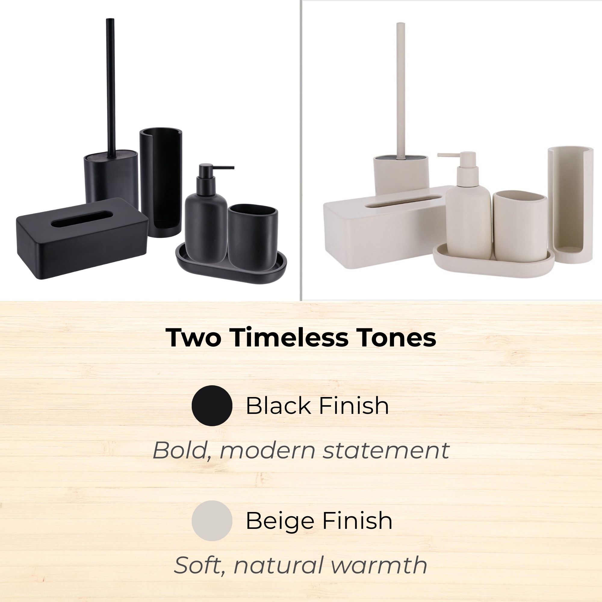 This versatile bath accessories set is offered in black or beige finishes, letting you choose the tone that suits your style.