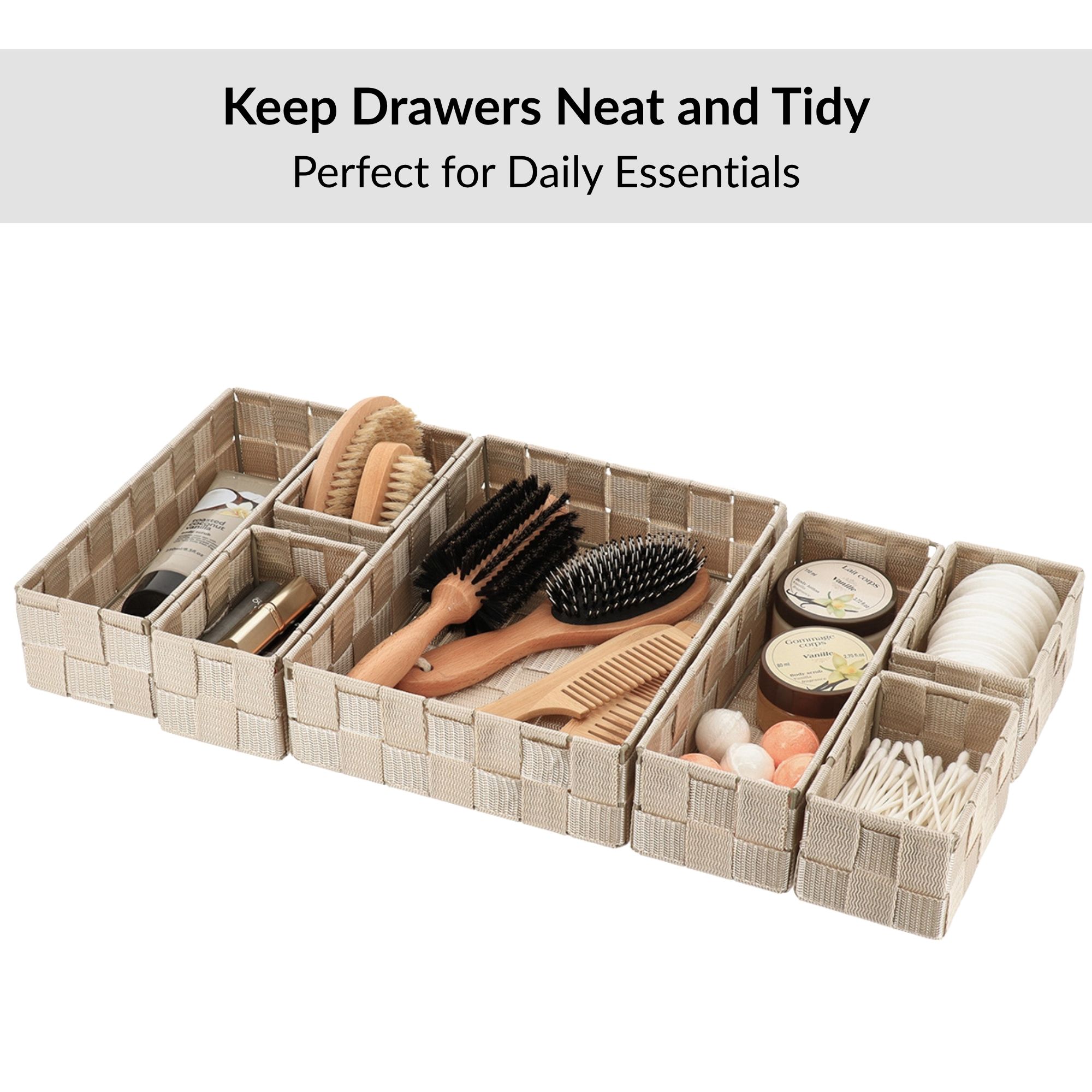 - MULTI-PIECE STORAGE SET: Includes 7 braided polyester drawer organizers in beige and assorted sizes to neatly organize drawers, shelves or countertops in any room