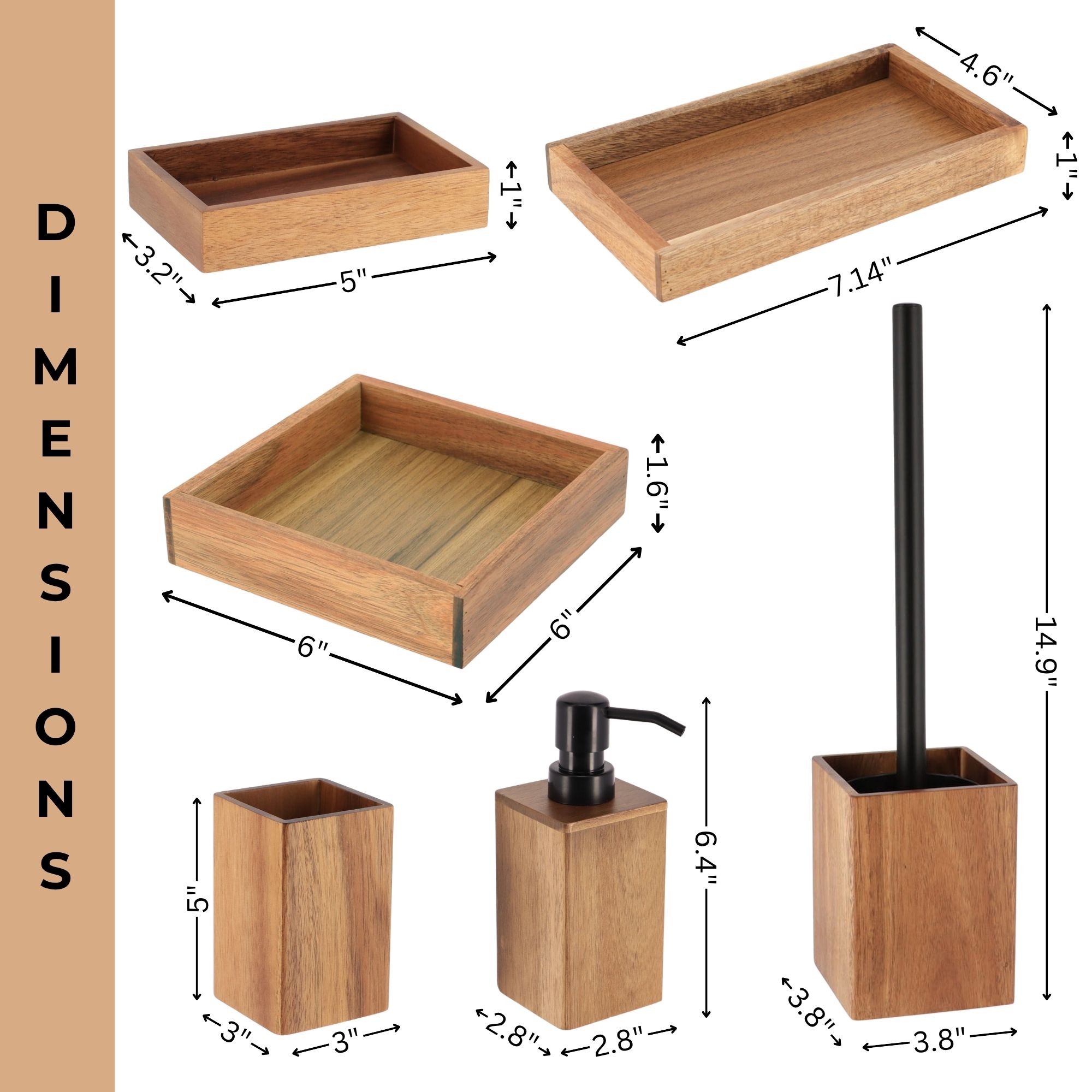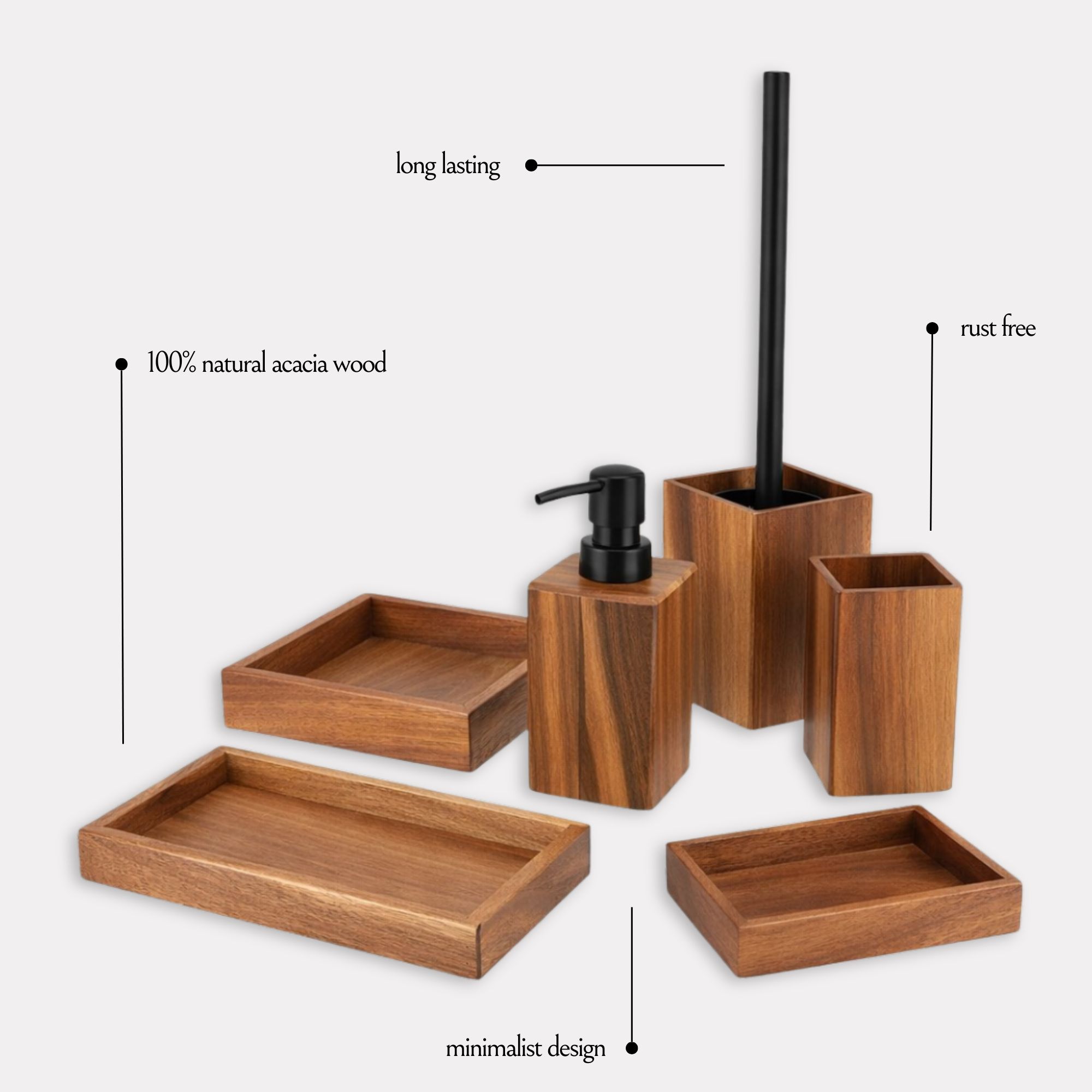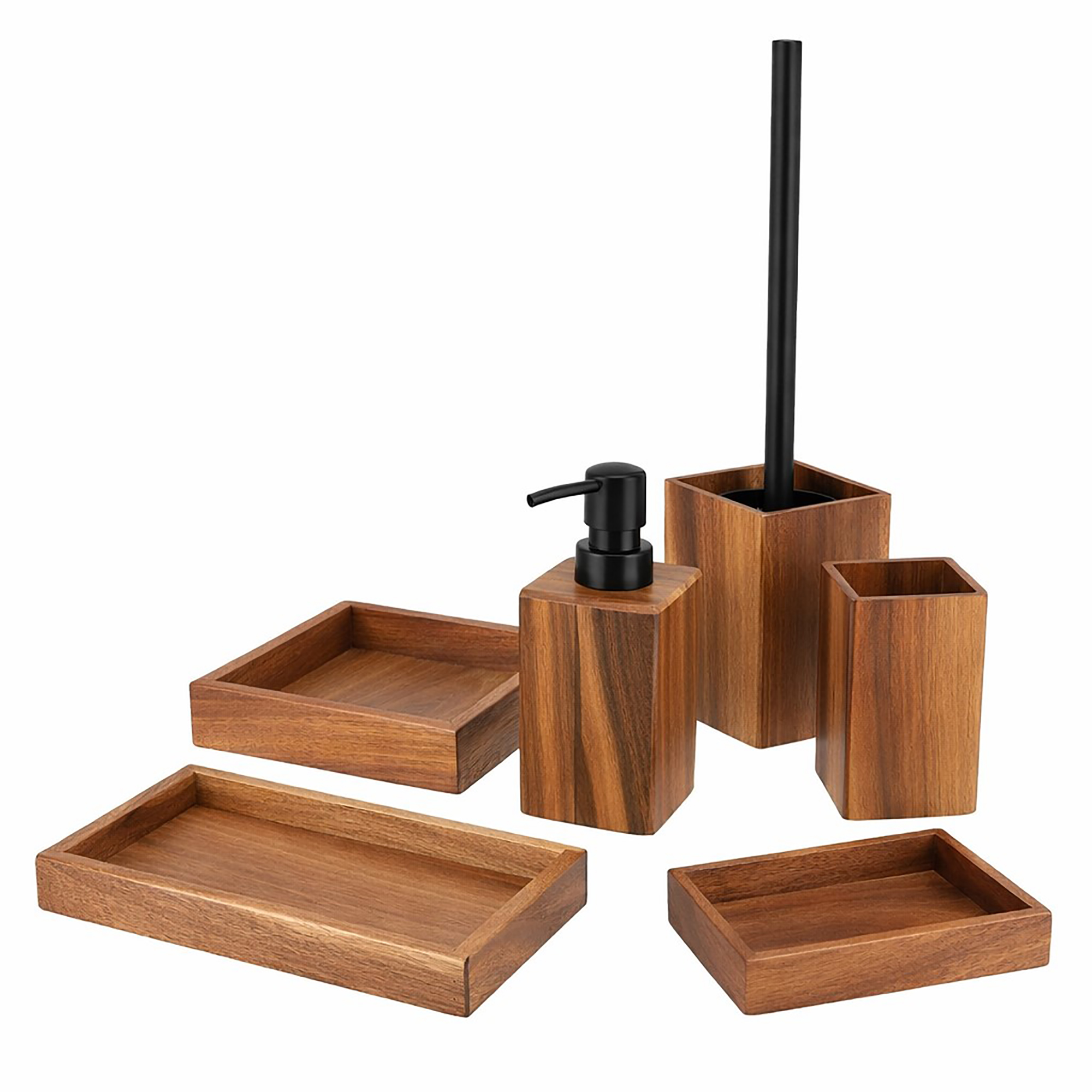 - 6 PIECES MATCHING COLLECTION: Complete your bathroom decoration with this set Acacia featuring a tumbler, a soap dispenser, a soap dish, a square and a rectangular tray, and a toilet bowl brush