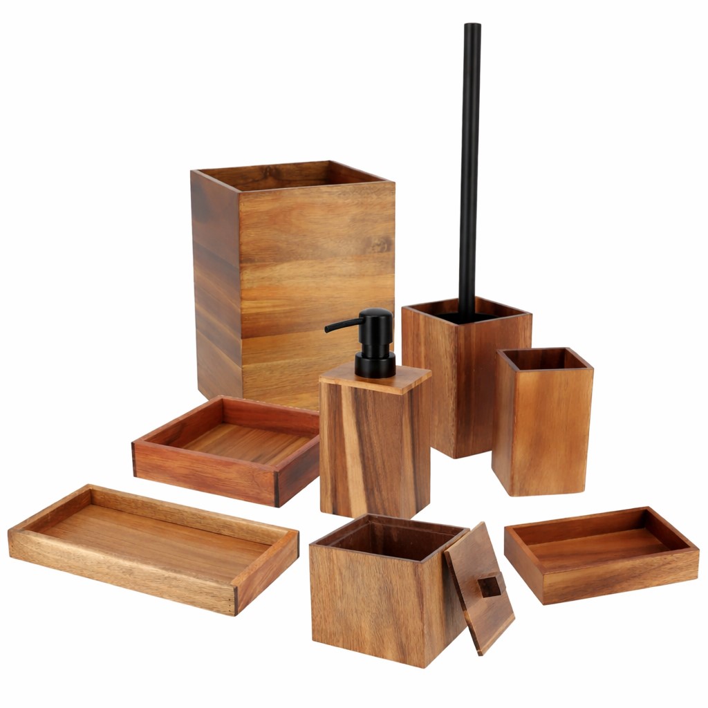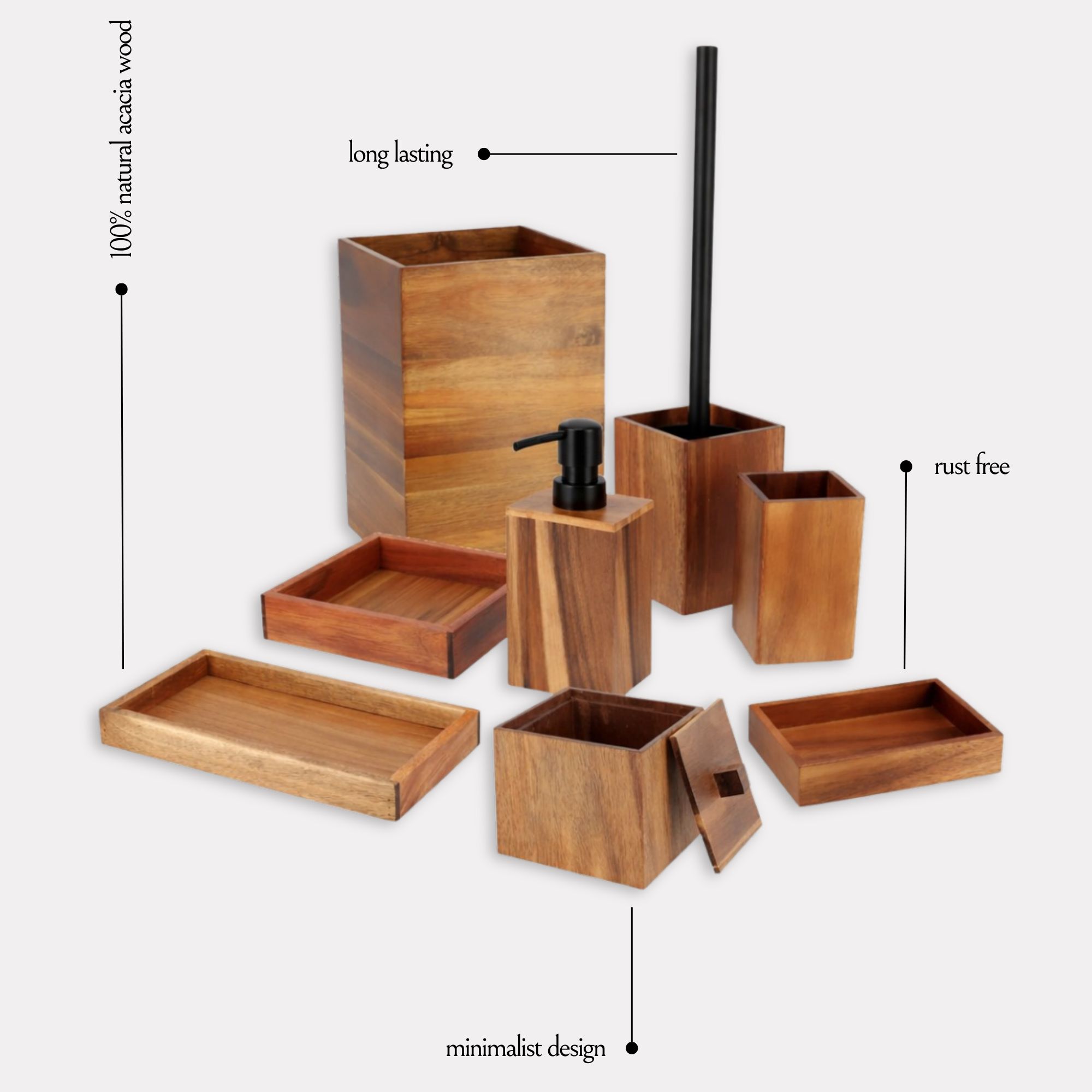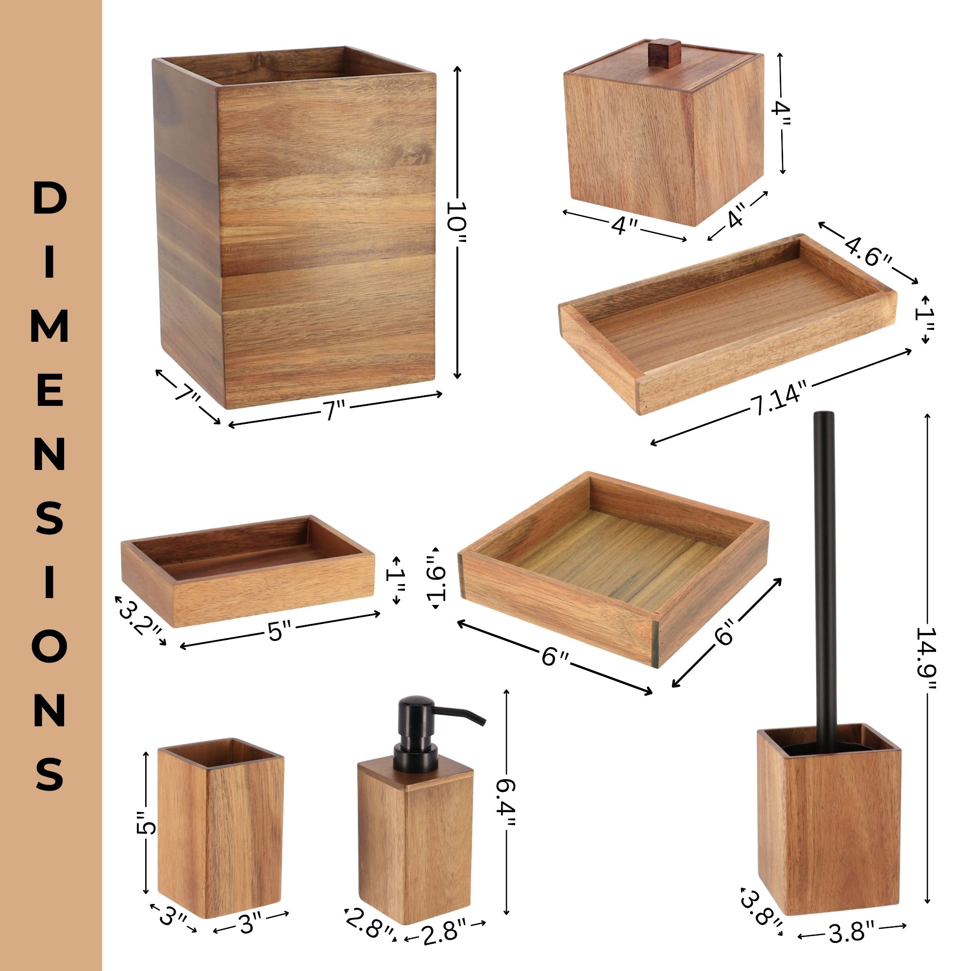 Crafted from natural acacia wood, each piece showcases a warm, modern aesthetic that blends seamlessly with various decor styles. Designed for durability, this set resists moisture, making it perfect for daily use. Included in this complete set are a soap dispenser, trays, toothbrush holder, soap dish, toilet brush, trash can and storage box. With its minimalist design, this bathroom set creates a clean and organized space while adding an elegant wooden touch. Featuring a sleek black pump, the soap dispenser provides easy dispensing while complementing the wood’s natural beauty.