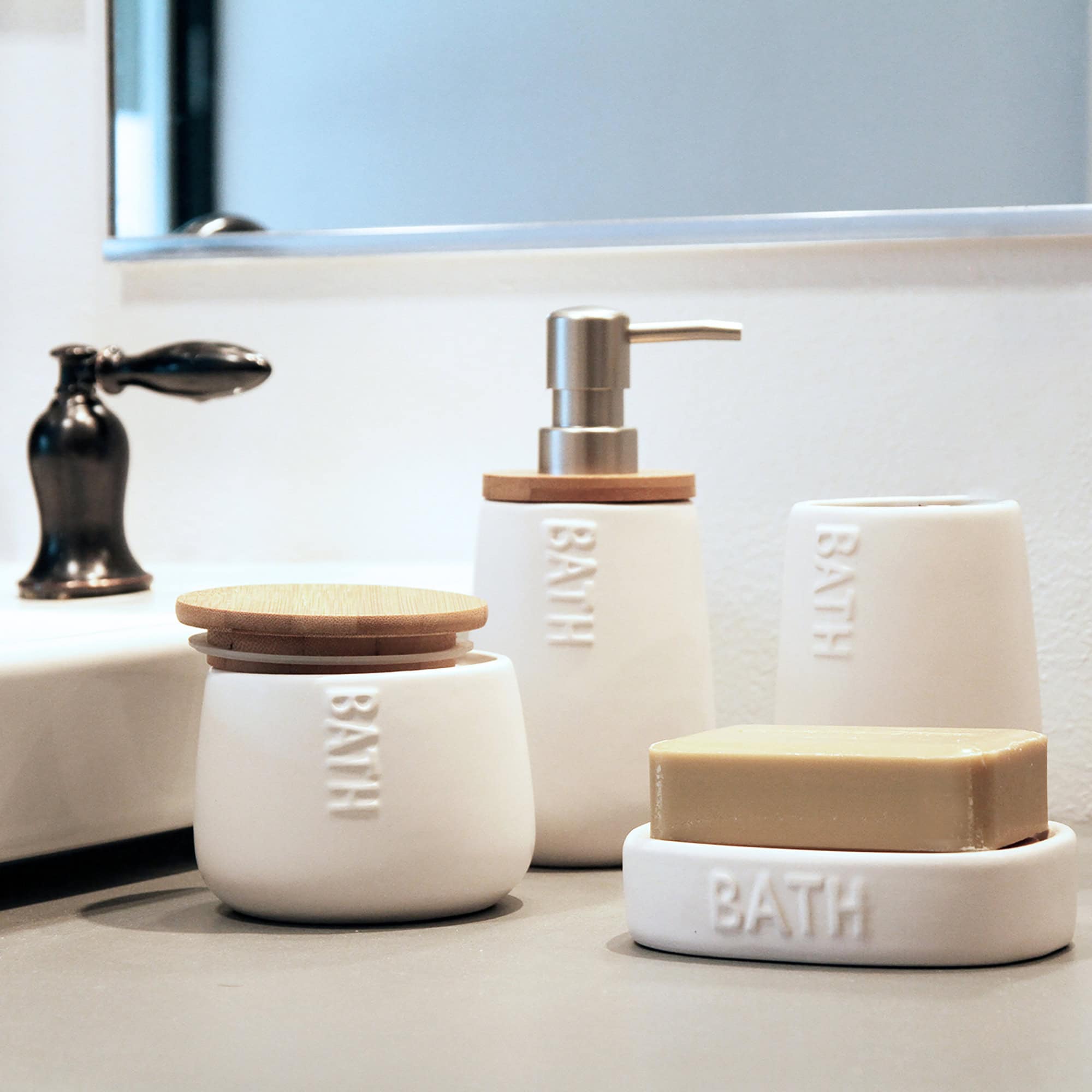 Bath D Soap Dish Cup Dispenser White and Bamboo Tray