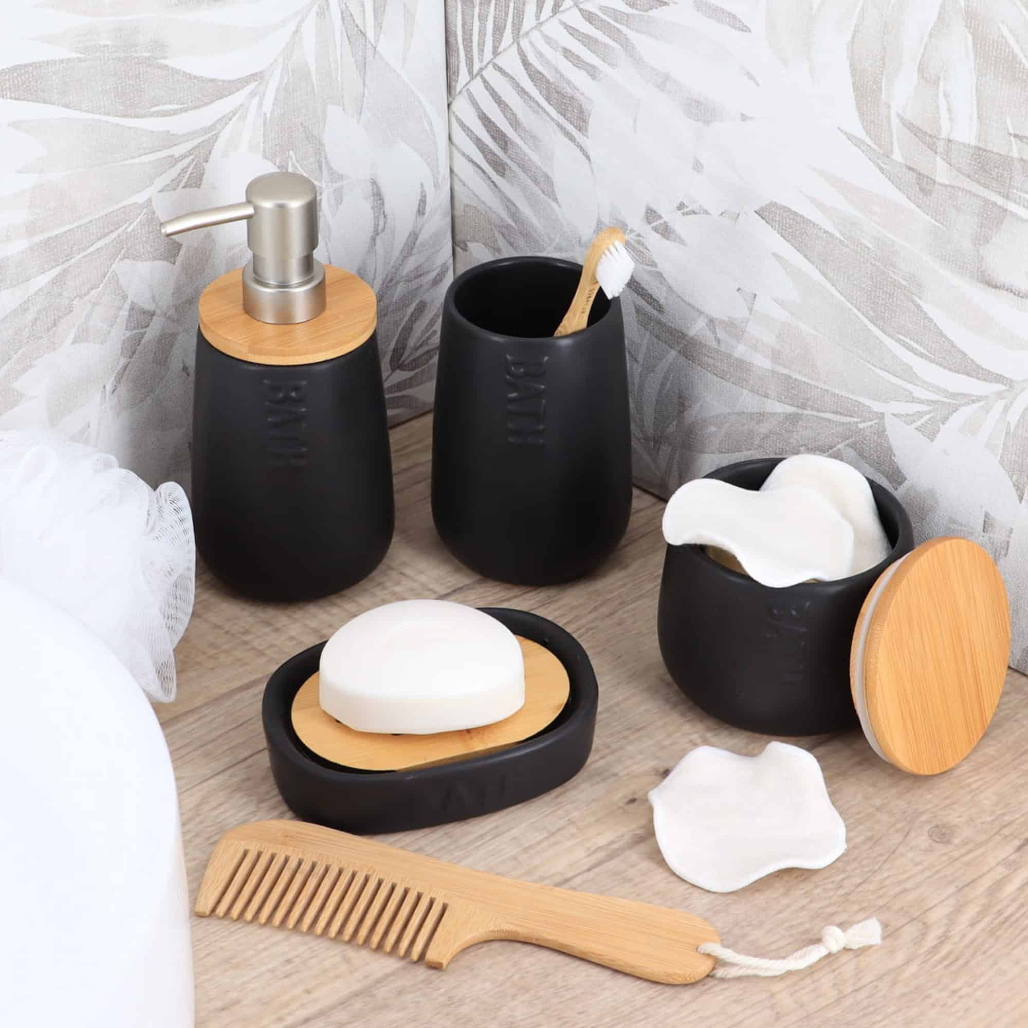 Bath D Soap Dish Cup Dispenser Black and Bamboo Tray