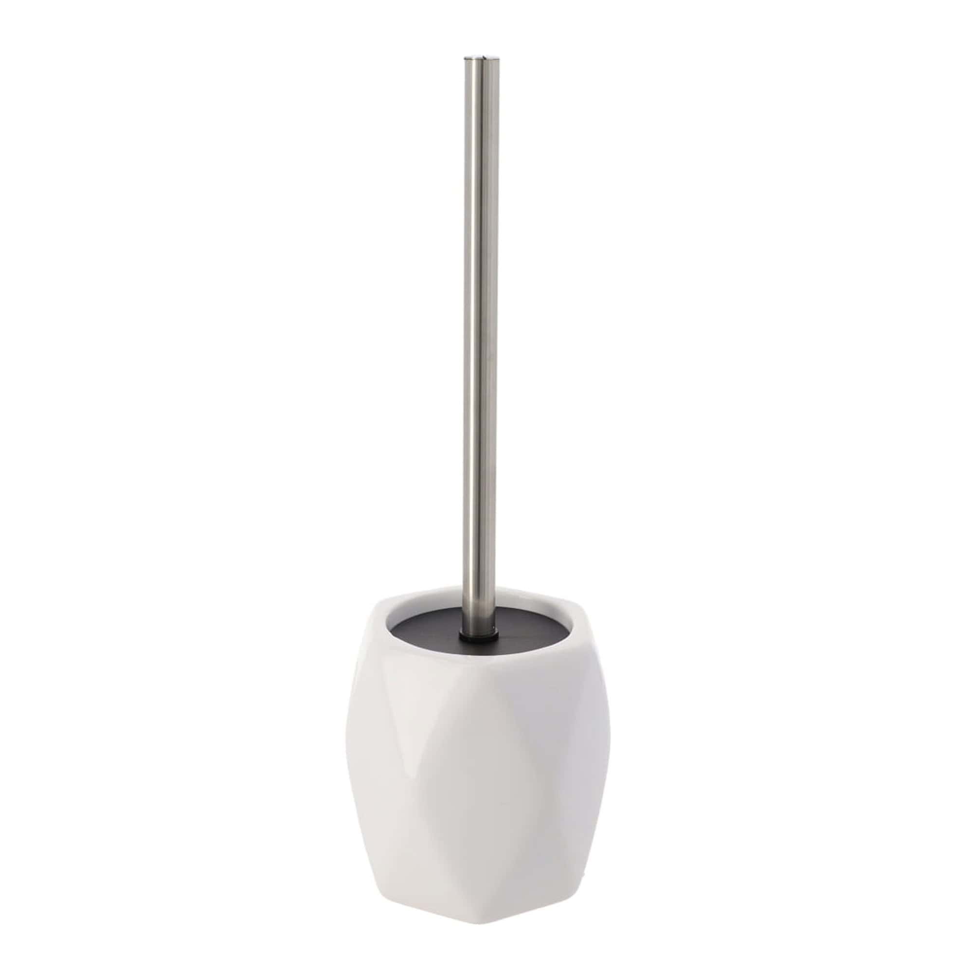 Keep your bathroom squeaky clean with this nice white diamond-shaped toilet bowl brush and holder. Contemporary, yet elegant, this toilet brush will flatter any bathroom with its lovely hexagonal shape appearance while holding a black tapered head. Use the sturdy-bristled brush head to deep clean, even places hard to reach, for a lasting shine.