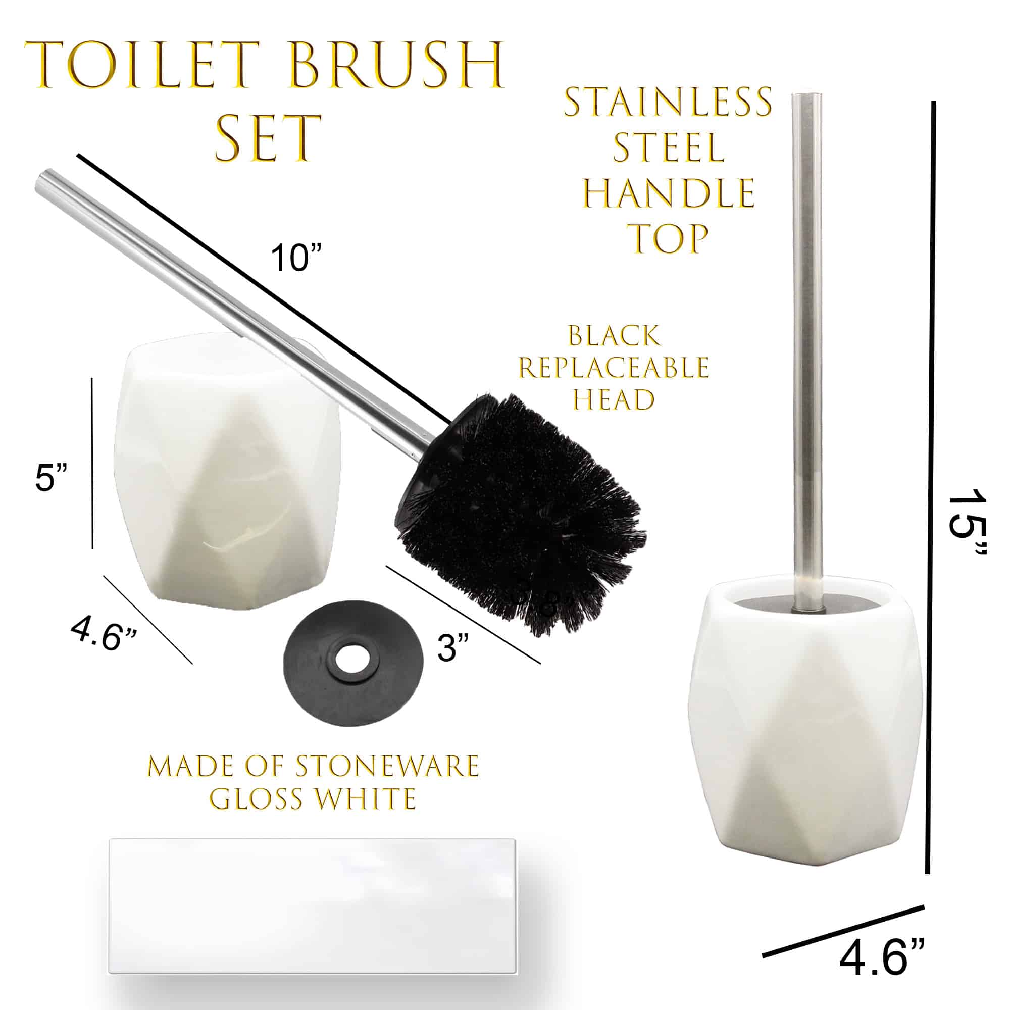 - PREMIUM QUALITY: This bathroom toilet brush holder features a smooth stoneware hexagonal base and a handle made of stainless steel. The heavy stoneware base keeps the bowl brush secure and holds the handle straight, the bottom is textured to avoid any slippage from the floor. Rust free, this toilet brush will last for years and will fit perfectly near your toilet. Also suitable for commercial use.