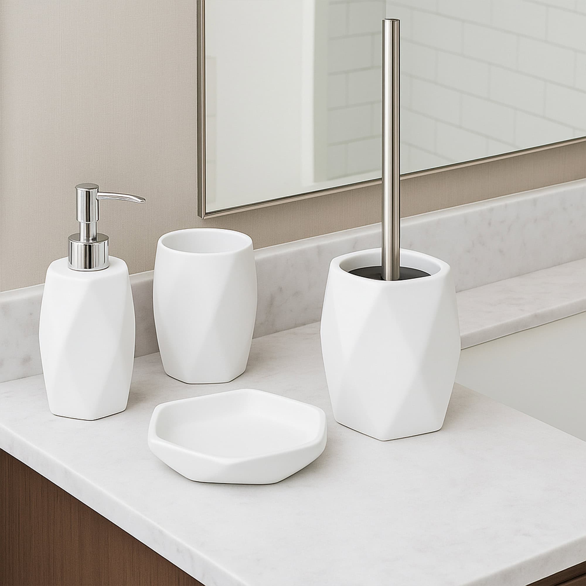 Bath Toilet Bowl Brush and Holder Diamond Stoneware White