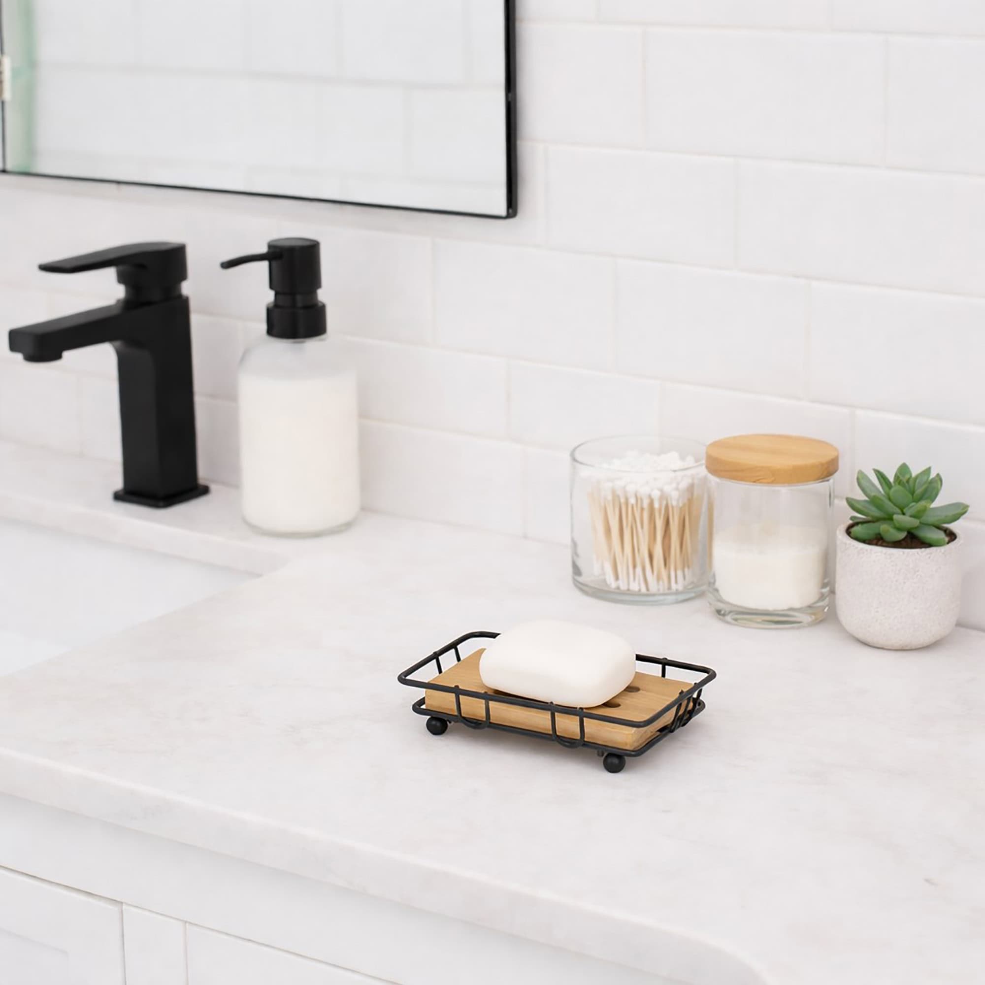 Bathroom Soap Dish Bamboo Tray Black Metal Wire