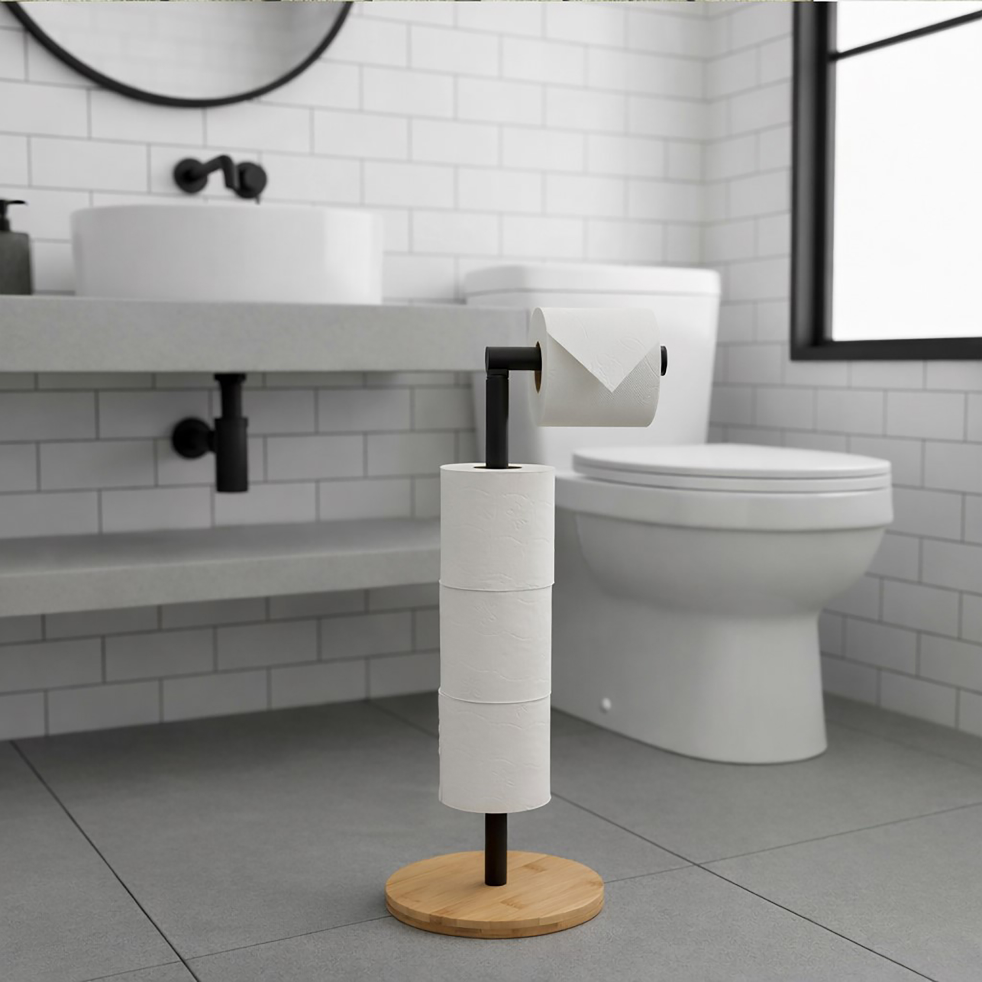 Black Freestanding Toilet Paper Holder Stand with Bamboo Base