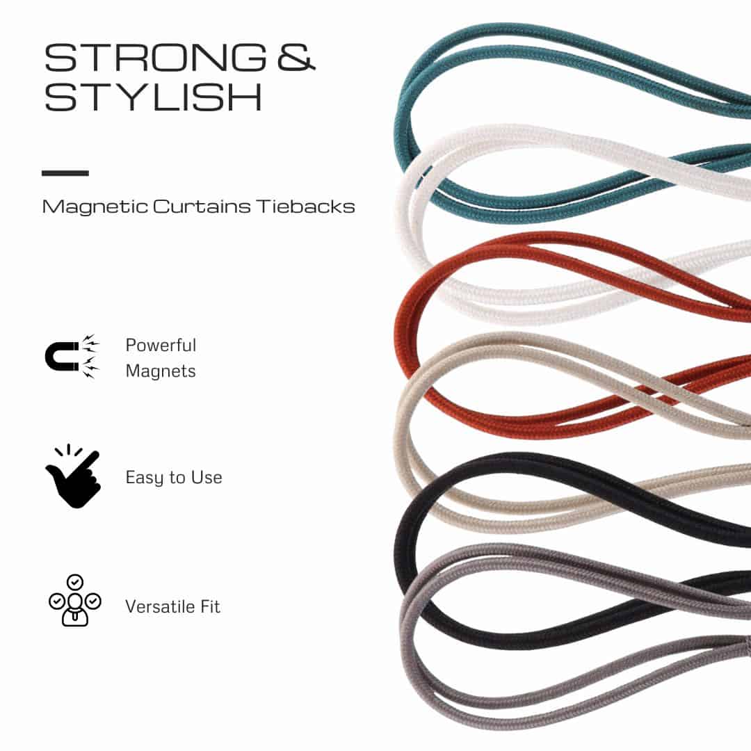 First, the strong built-in magnets securely hold your curtains without drilling or hardware. Then, the double-braided polyester cord ensures durability while remaining soft and flexible.