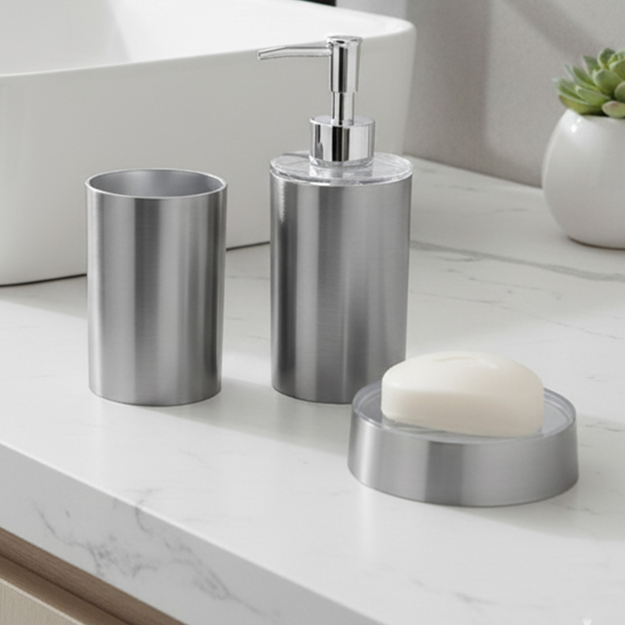 Keep your hands clean with this brushed aluminum bath hand soap for your bath, kitchen sink, or utility room vanity. Liquid soap dispensers are ideal for areas where bar soap just doesn’t make the grade.