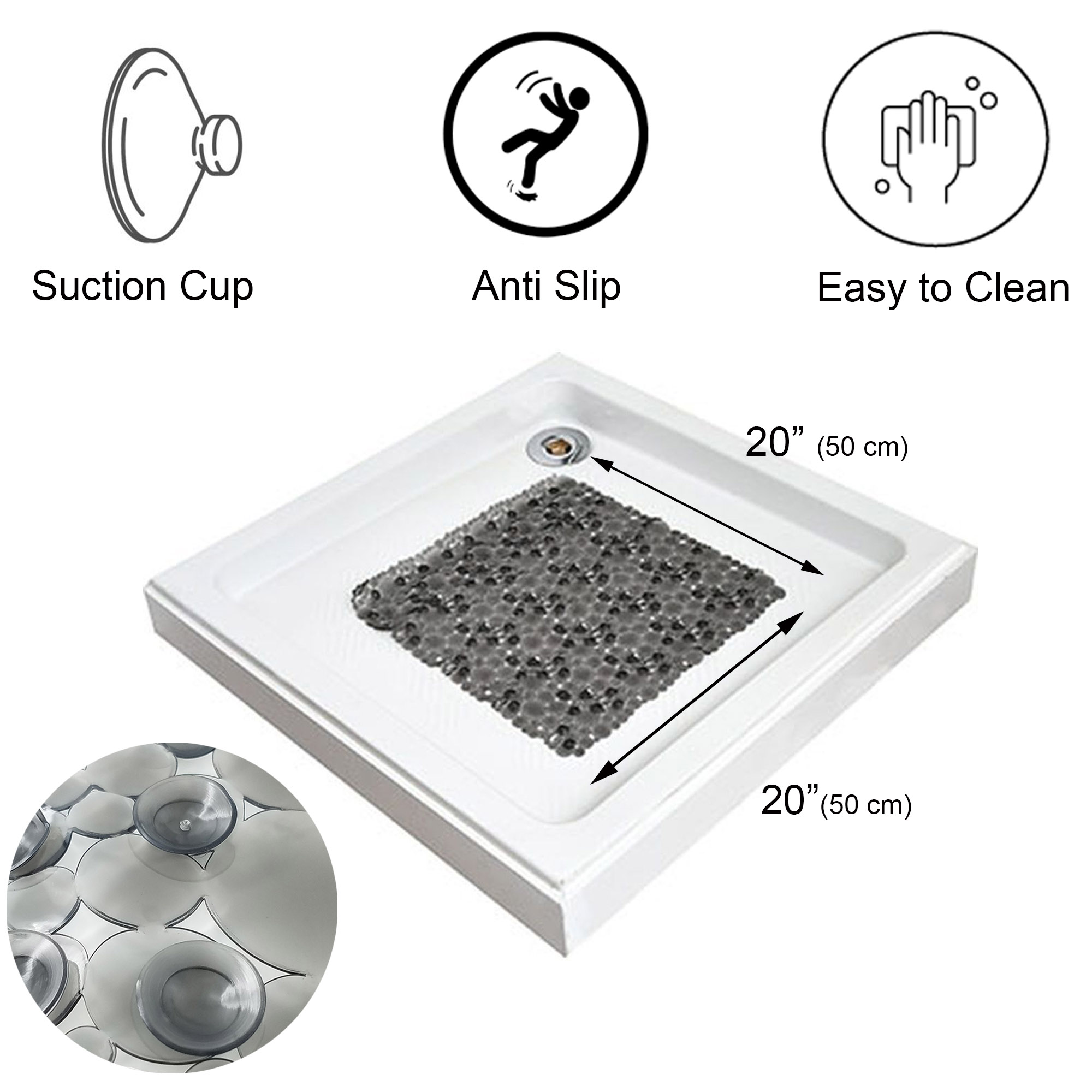 - PERFECT SIZE: 20 x 20 Inches, this safety mat perfectly fits in your shower with its square shape, is also available for your bathtub with a rectangular shape (28 L x 15 W). Perfect choice for home, spa, gym and bathroom
