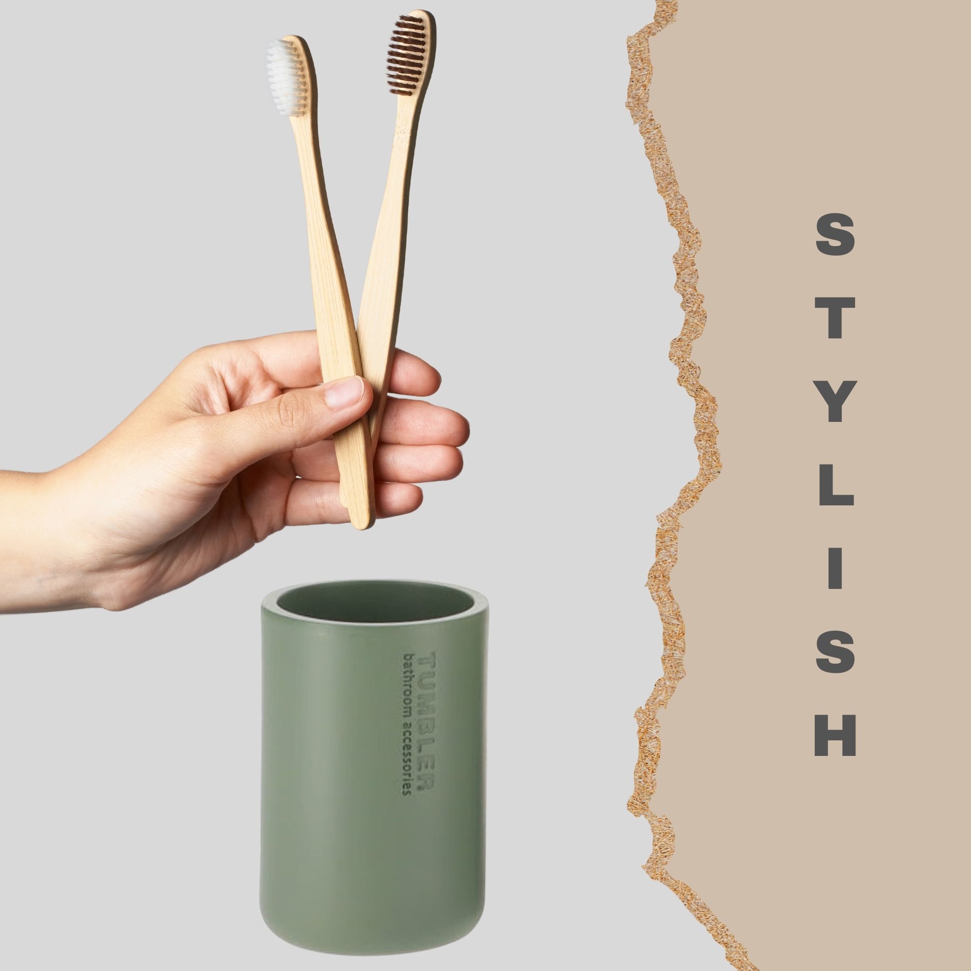 Introducing our Khaki Polyresin Tumbler and Toothbrush Holder, your ultimate solution for a tidy vanity countertop.