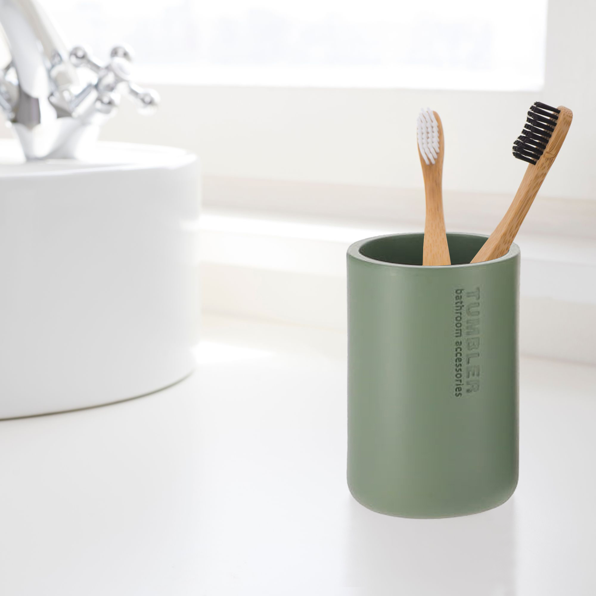 Chic Matte Green Bathroom Tumbler – Polyresin Toothbrush Holder, Modern Accessory for Vanity Countertop