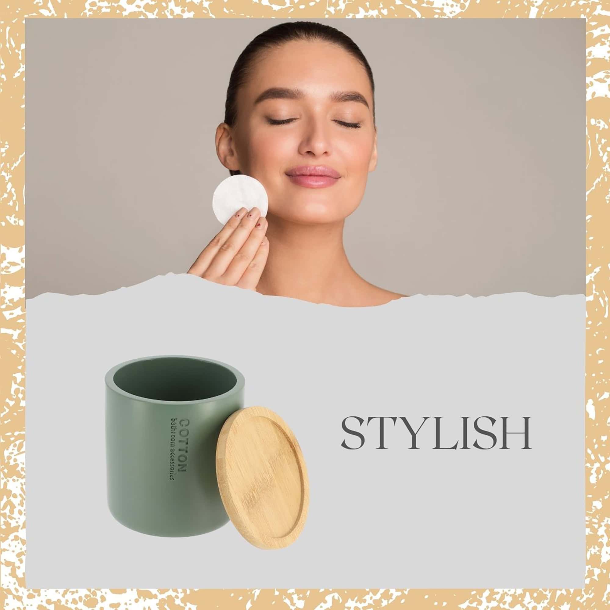 Durable, this polyresin cotton pads holder boasts a striking matte green finish. Coupled with a natural bamboo top, it exudes an air of sophistication.
