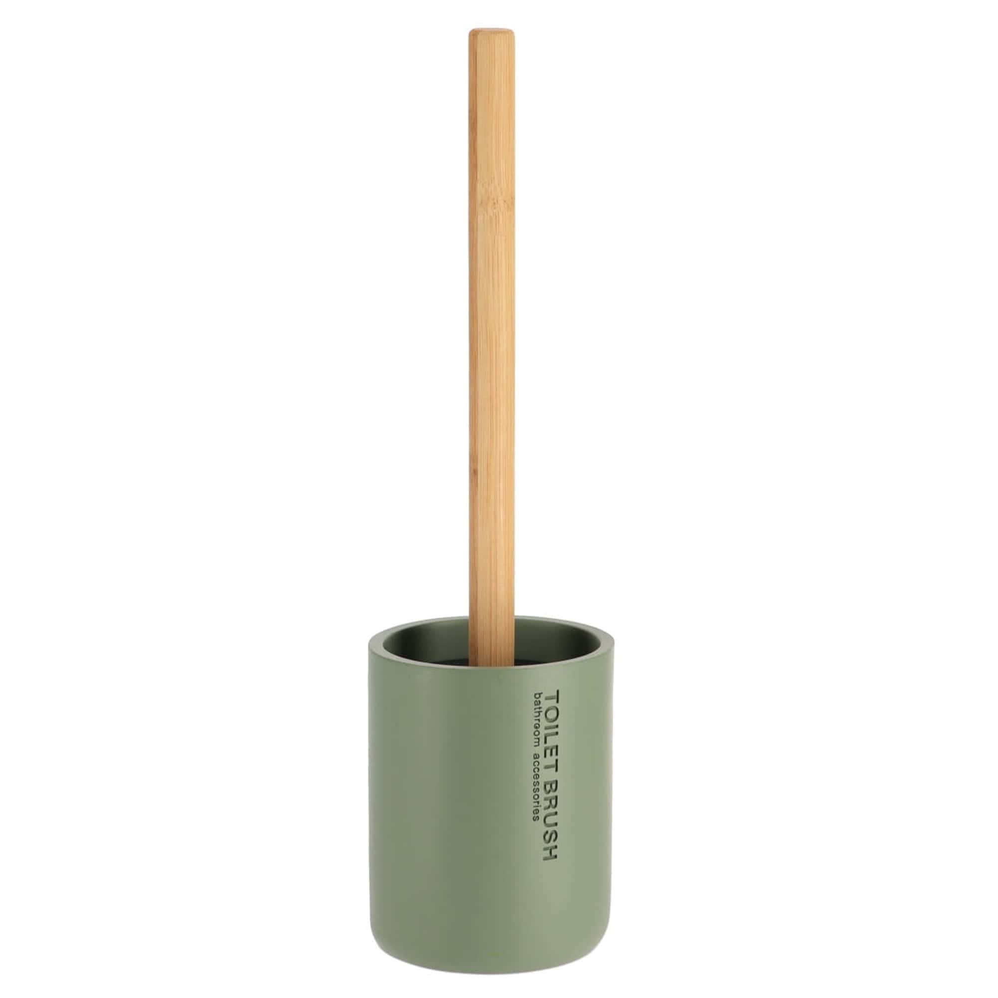 Chic Matte Green Toilet Brush Holder Set with Natural Bamboo Handle – Polyresin Bathroom Cleaning Accessory