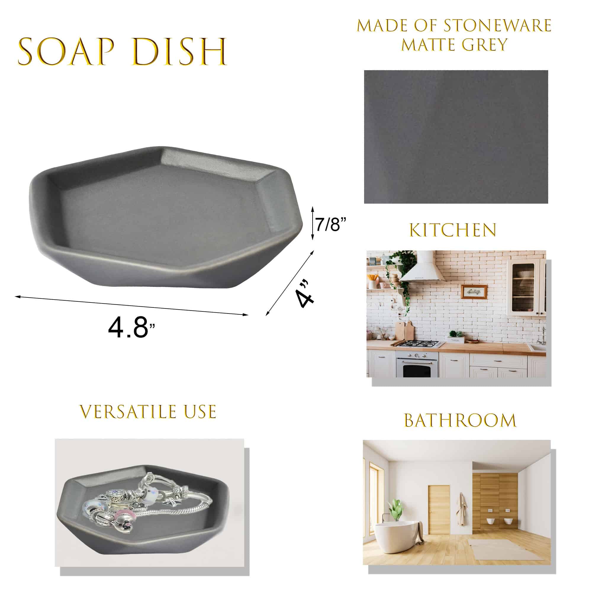 - PREMIUM QUALITY: This bath countertop soap dish is made of smooth stoneware which is rust free, the bottom is textured to avoid any slippage from the counter top. Rust free, this hexagonal shape soap dish holder fits perfectly on any vanity counter top with a length of 4.8 Inches, a width of 4 Inches and a height of 7/8 Inch (0.14 Inch)