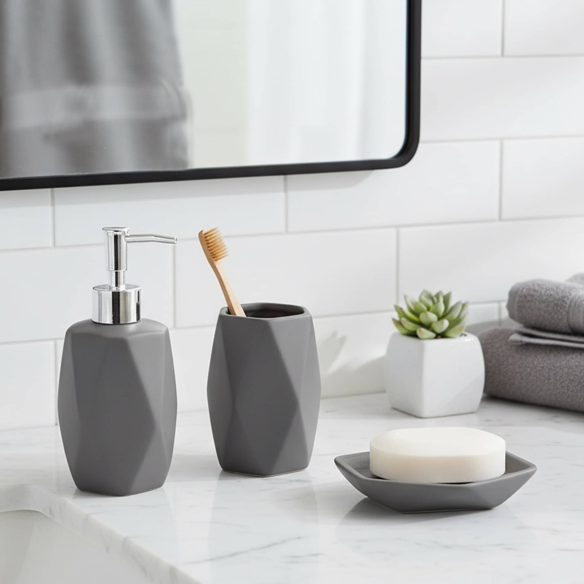 - DESIGNER ARTWORK: Enjoy the the unique design of this diamond-shaped soap holder cup. The smooth touch combined with the white, black or grey color and the unique hexagonal design brings a sophisticated and modern style to your bathroom