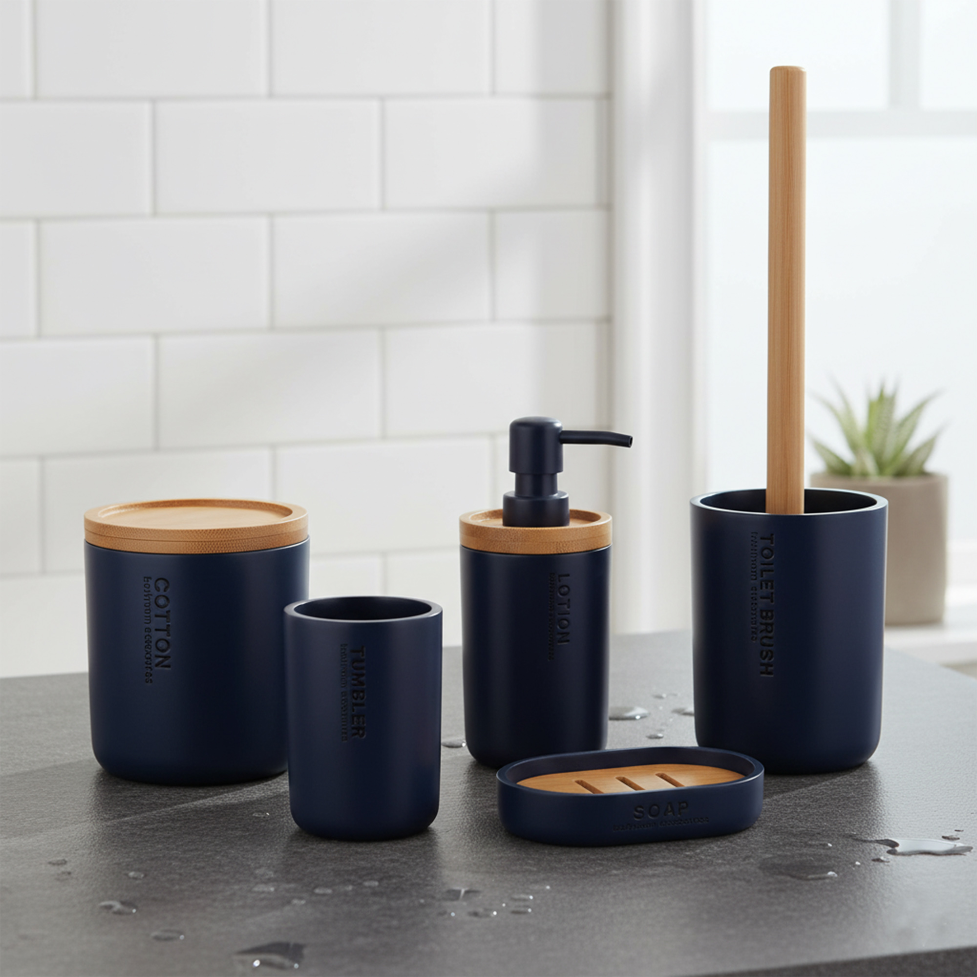 Navy Blue Bathroom Accessories with Natural Accents, Modern 6-piece Set
