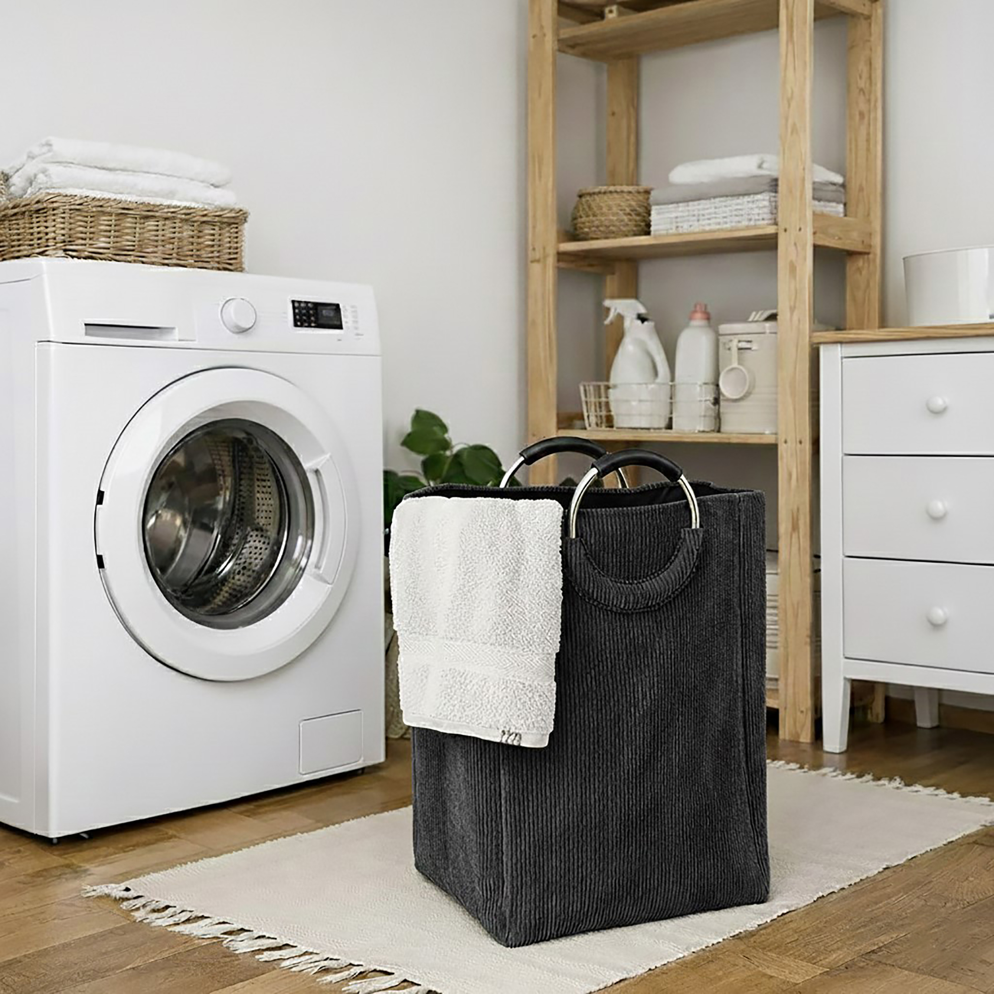 Upgrade your laundry routine with this stylish 55L Charcoal Gray Corduroy Laundry Hamper.