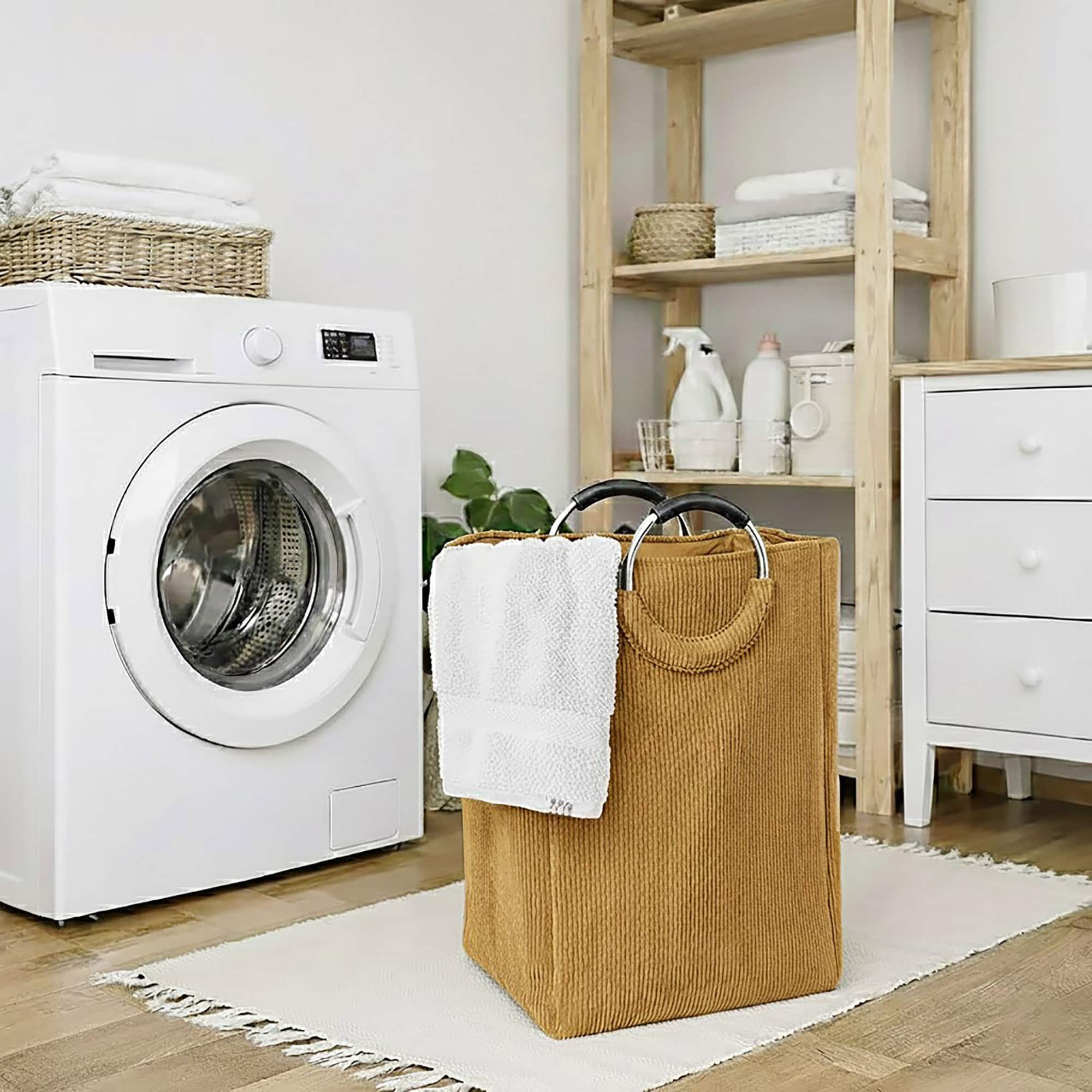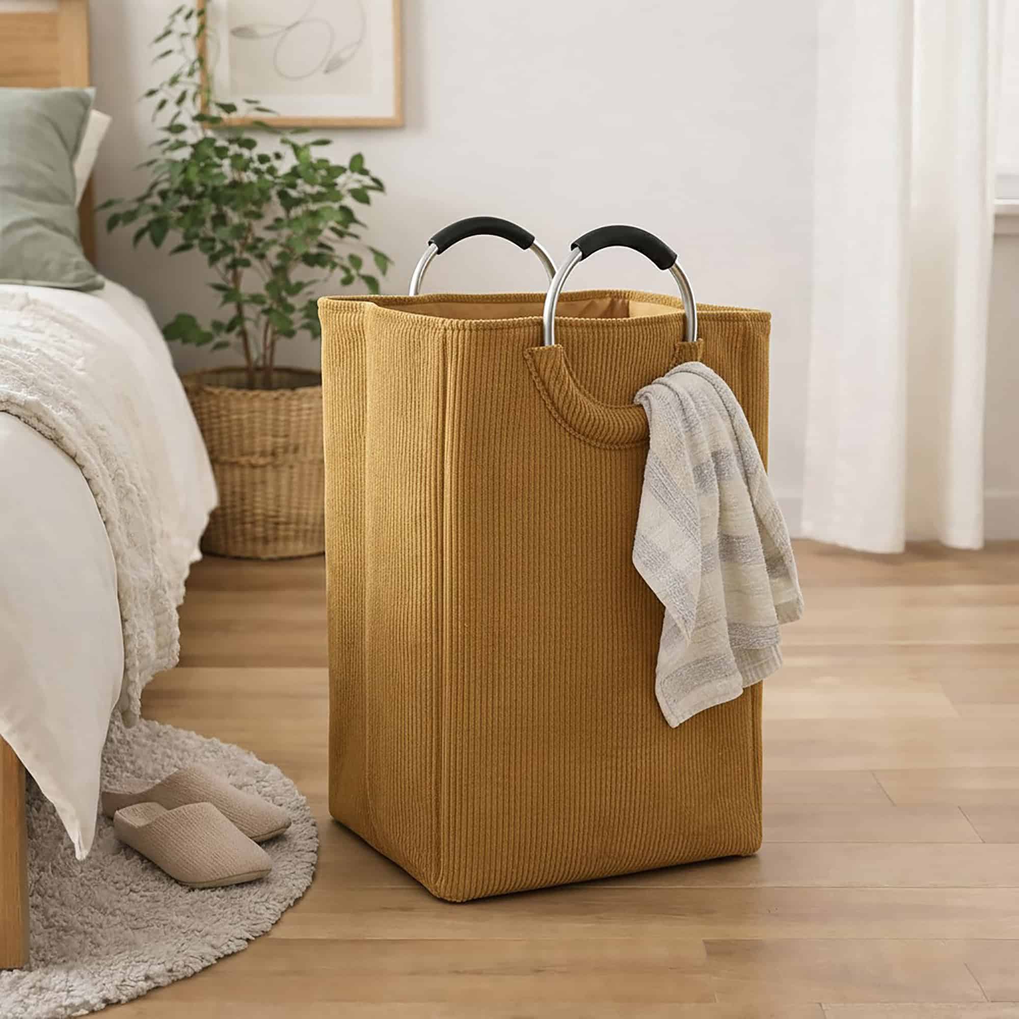 • SOFT CORDUROY EXTERIOR: Elegant mustard yellow corduroy fabric gives a cozy, modern look that complements any decor, providing a soft, structured laundry storage solution