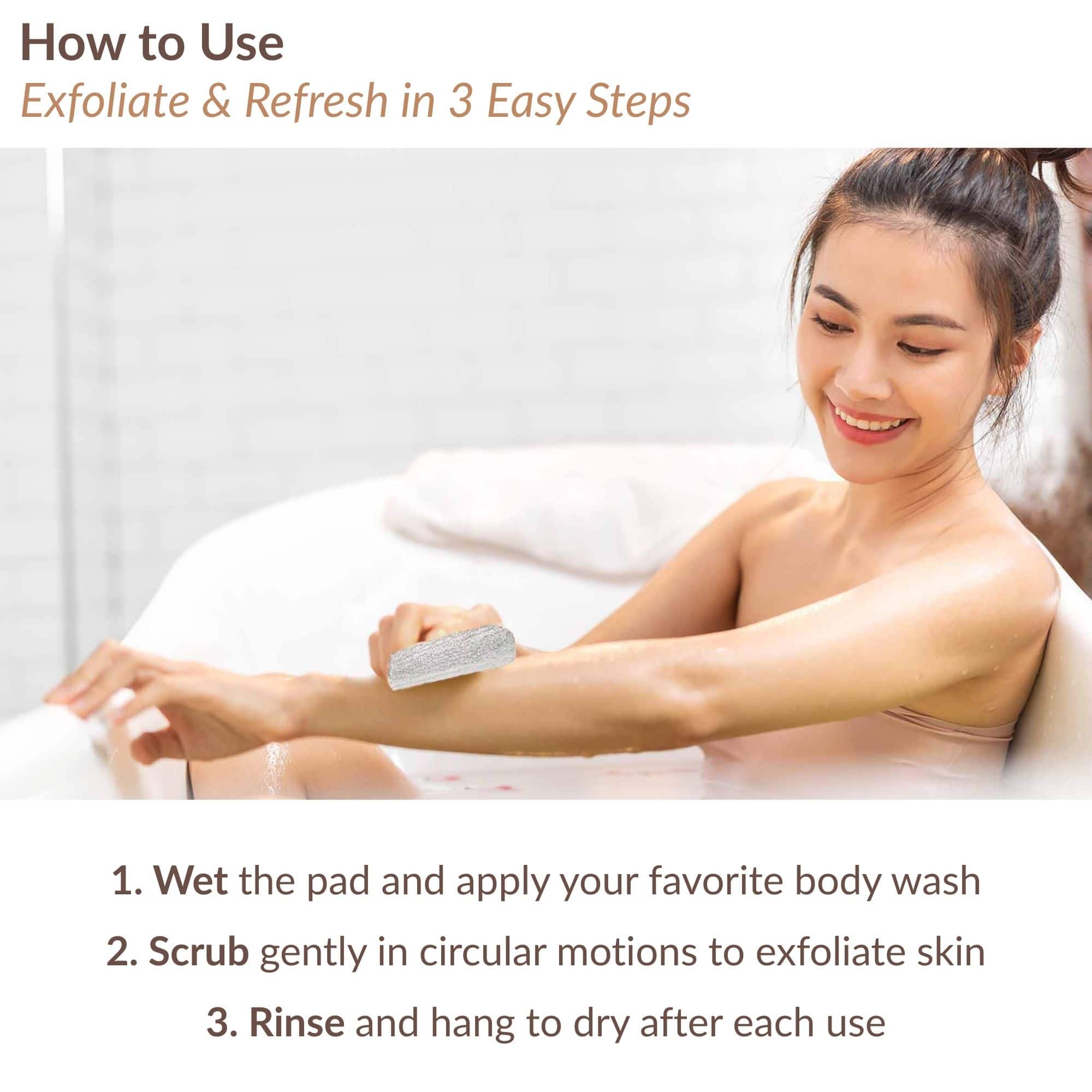 - SIMPLE 3-STEP USE: Wet pad, apply your favorite body wash, scrub gently in circular motions. Great face exfoliator for daily routine