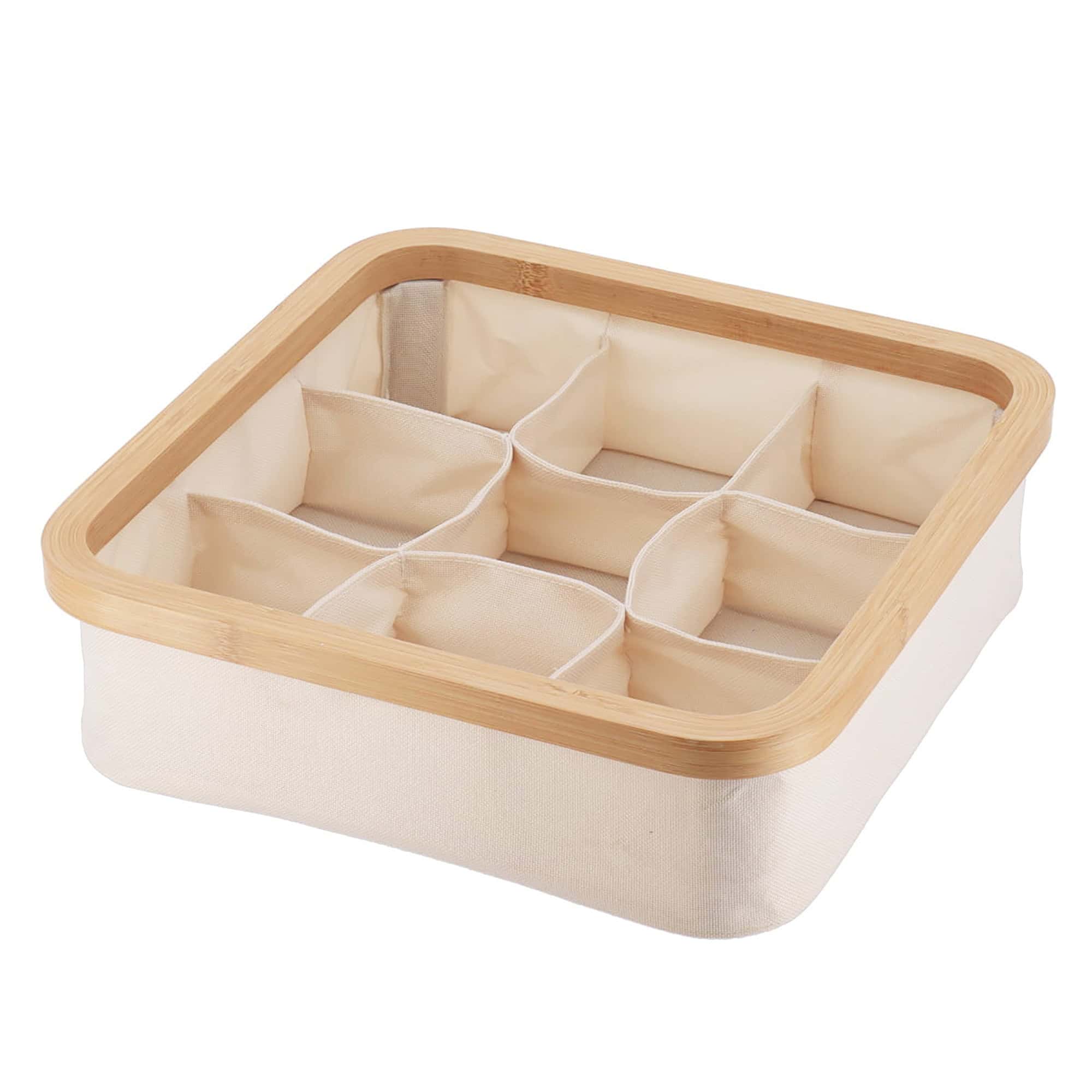 Square Foldable Storage Basket with Bamboo Frame and Ecru Fabric, 9-Compartment Organizer for Home and Office