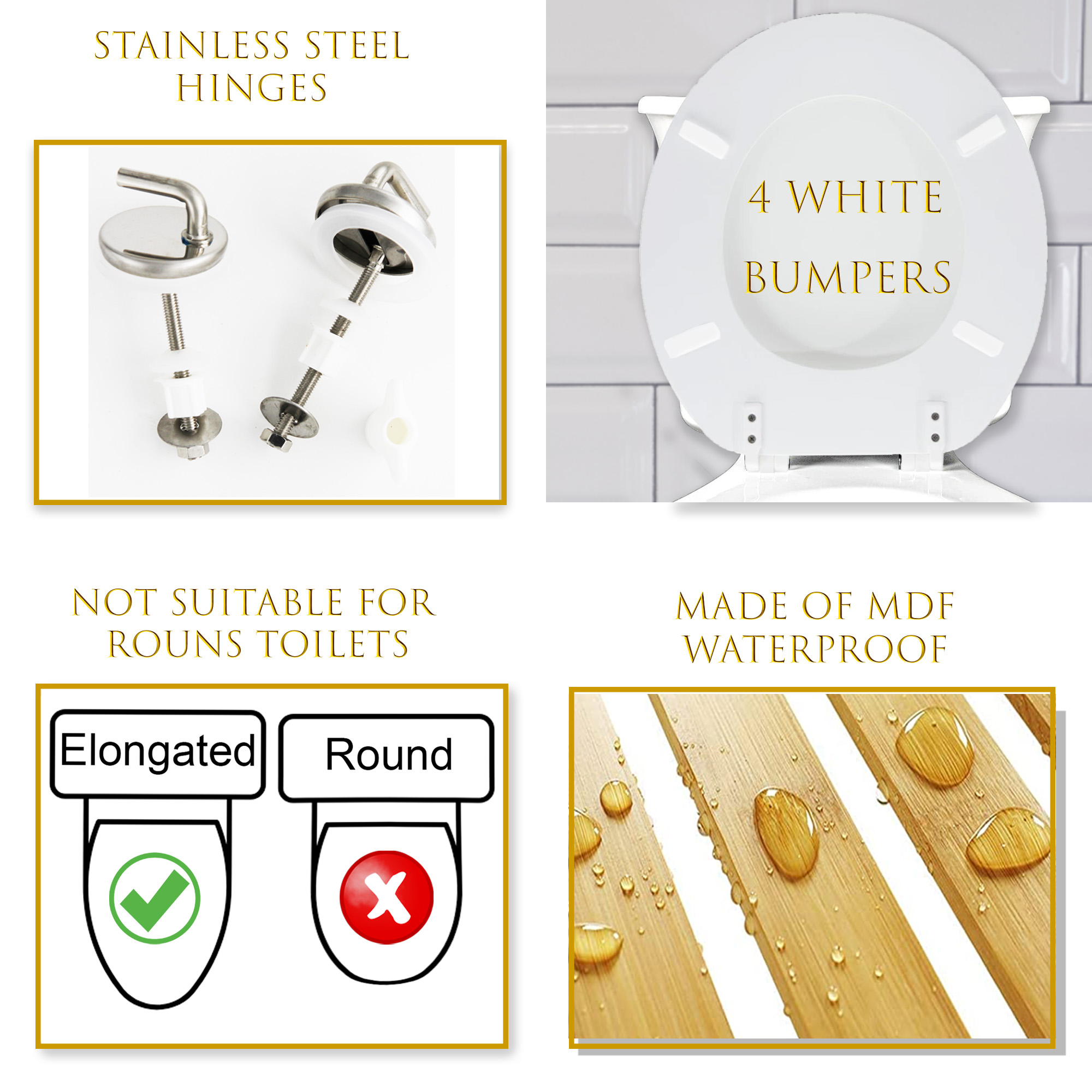 - QUALITY : Made of molded wood with a beveled edge, with rust-free zinc hinges. The clear coat enamel offers durability and a nice glossy finish. 4 bottom grip-tight bumpers will protect your toilet seat from damage