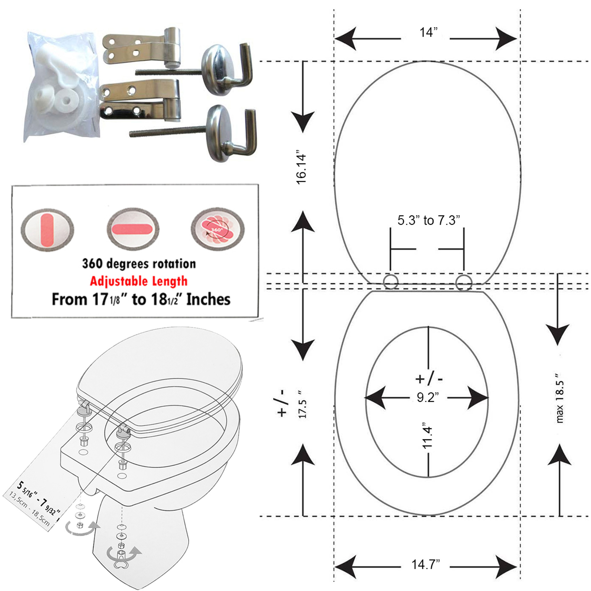 - ADJUSTABLE LENGTH : 360 degrees rotation zinc hinges. Ideal for adjusting the space between the hinges (from 5.31 to 7.28 inches) and for increasing the length of the toilet seat from 17.5 to 18.5-Inch!