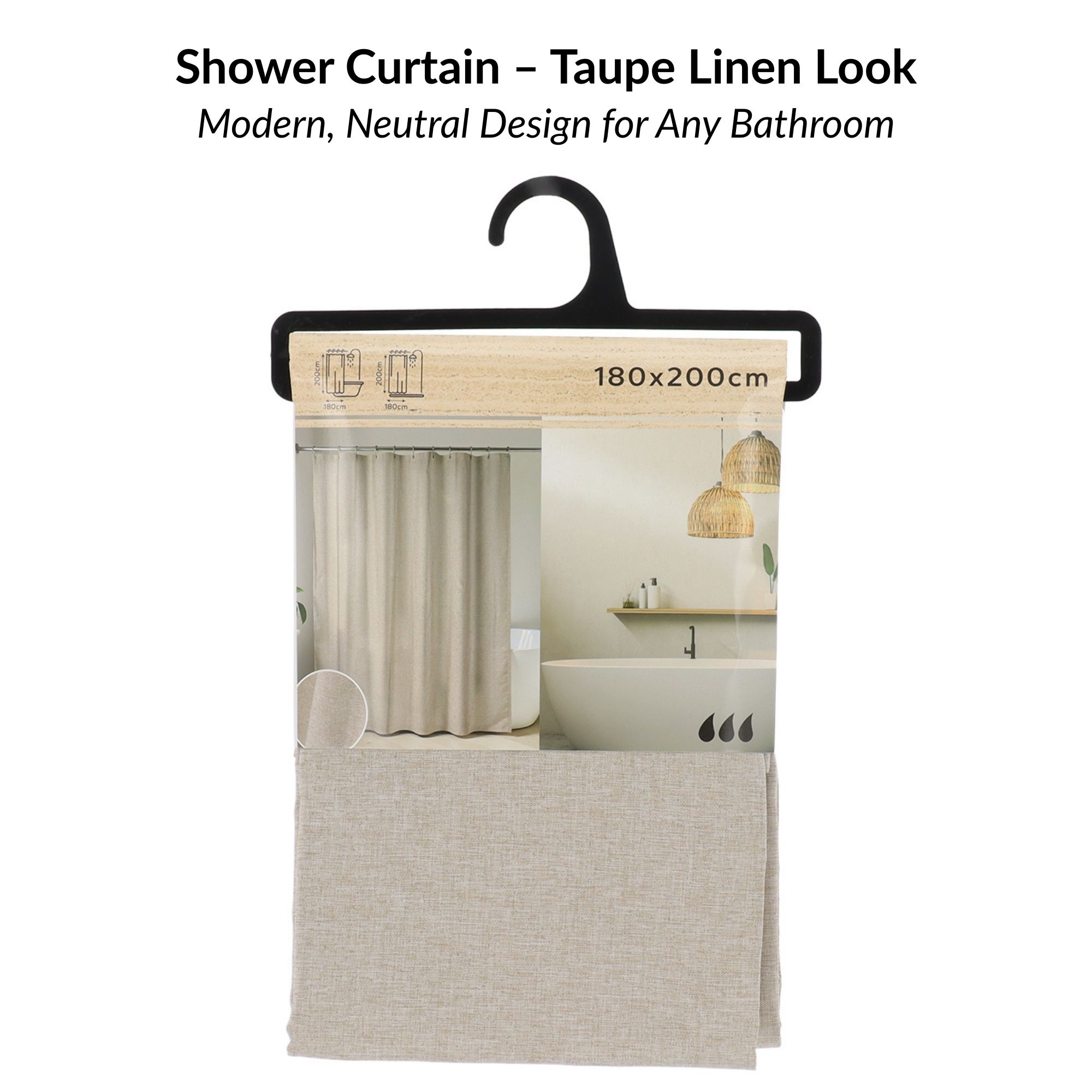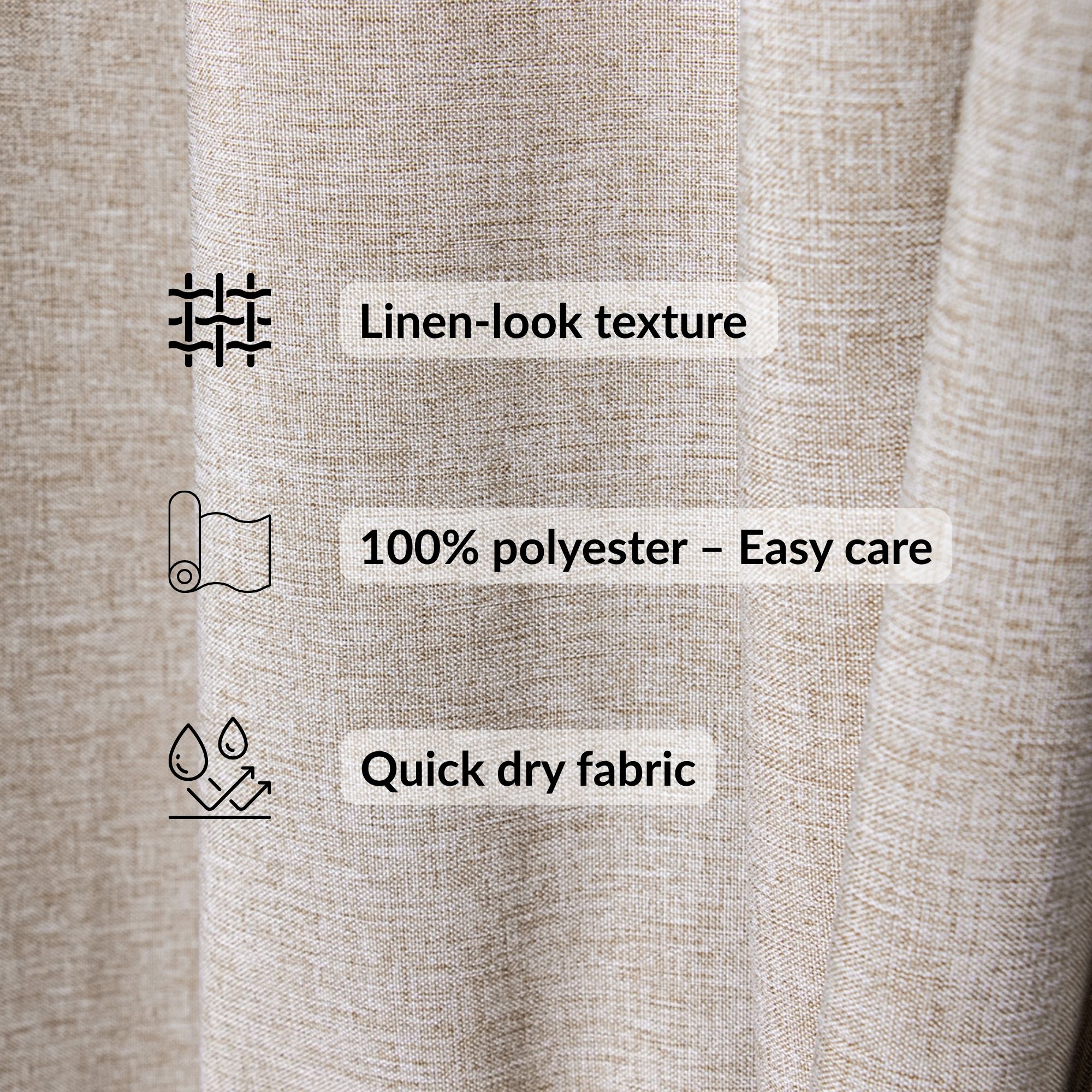 - LINEN-LOOK DESIGN: Taupe fabric with a linen-style texture that blends with many bathroom decors. Offers a neutral panel suitable for tubs or showers