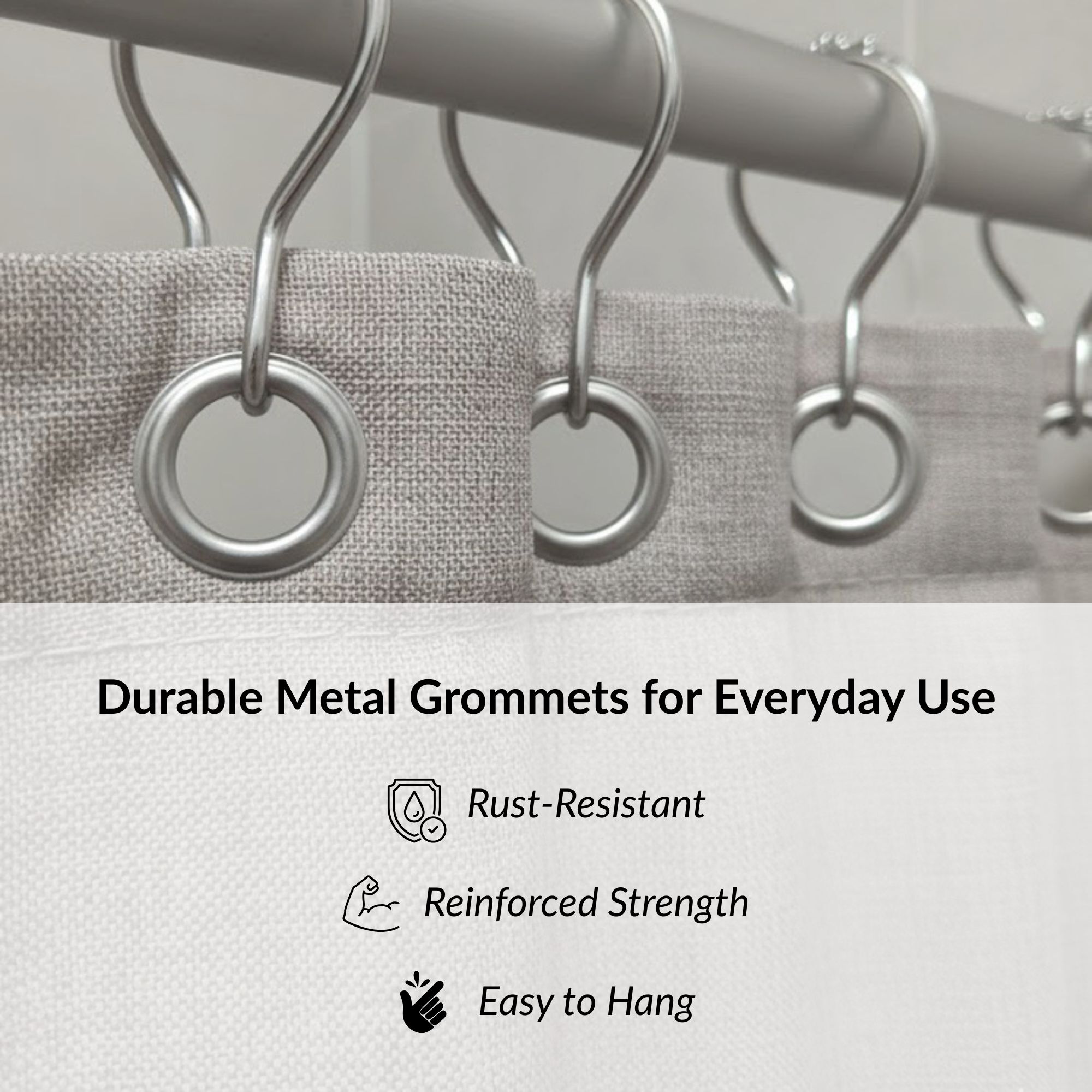 Its neutral tone blends easily with many decors. Additionally, the 71×79 in (180×200 cm) size offers generous coverage for tubs or walk-in showers. Furthermore, the extended length helps reduce water splashes during daily use. Likewise, the fabric shower curtain hangs smoothly and keeps a neat shape. Moreover, the bathroom shower curtain features reinforced metal grommets for steady support on standard rods. Also, they allow quick installation without tools. Meanwhile, the linen-look texture adds visual interest while keeping a simple appearance. Plus, the fabric design provides an alternative to vinyl or PEVA bathroom curtains. Since easy care is important, the bathroom curtain supports machine washing at 40°C. In addition, low-heat ironing keeps the fabric smooth. However, it should not be bleached, tumble dried, or dry cleaned. Finally, this cloth shower curtain fits various bathroom layouts and coordinates with many accessories.