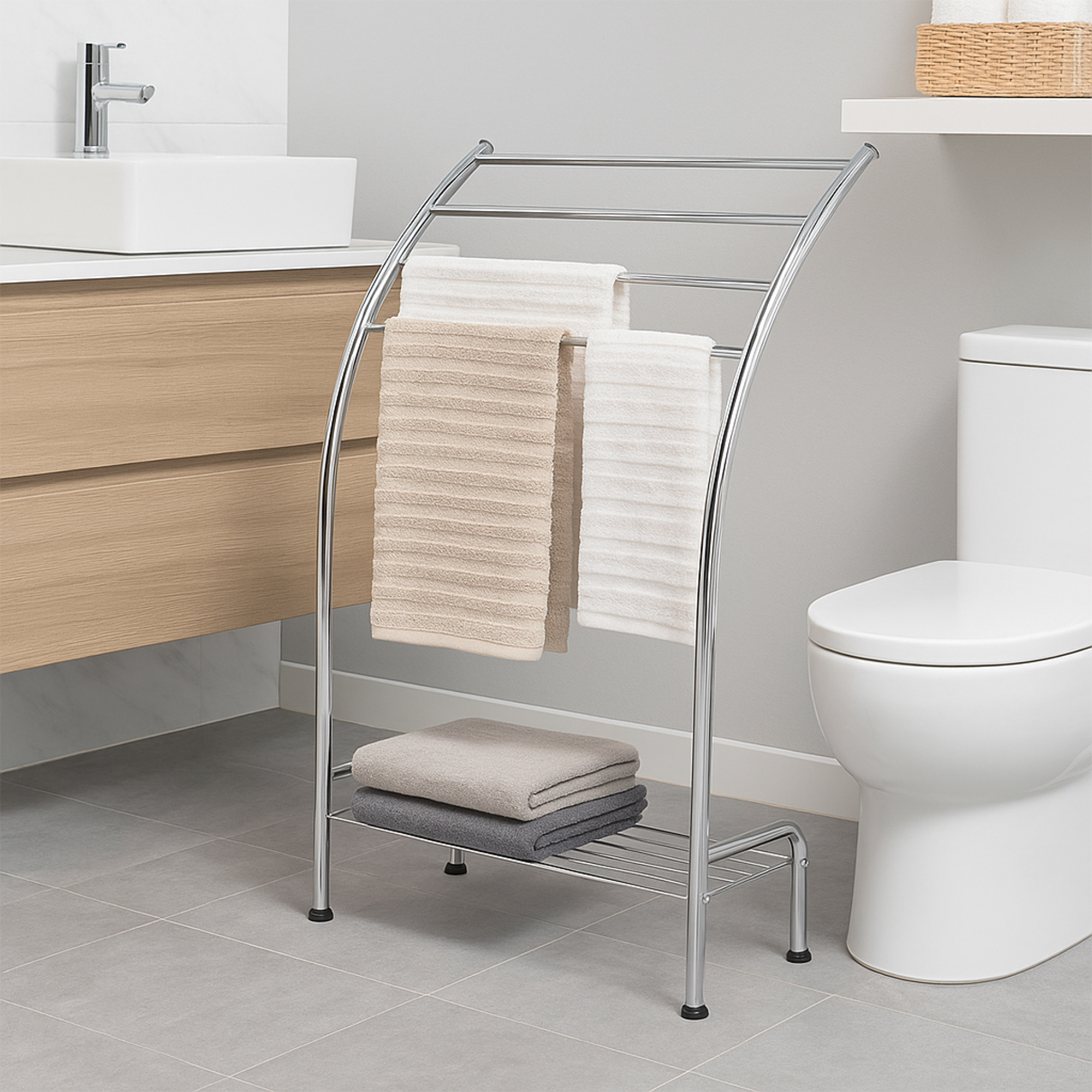 Freestanding Curved 3 Towels Stand with Shelf Chromed Metal