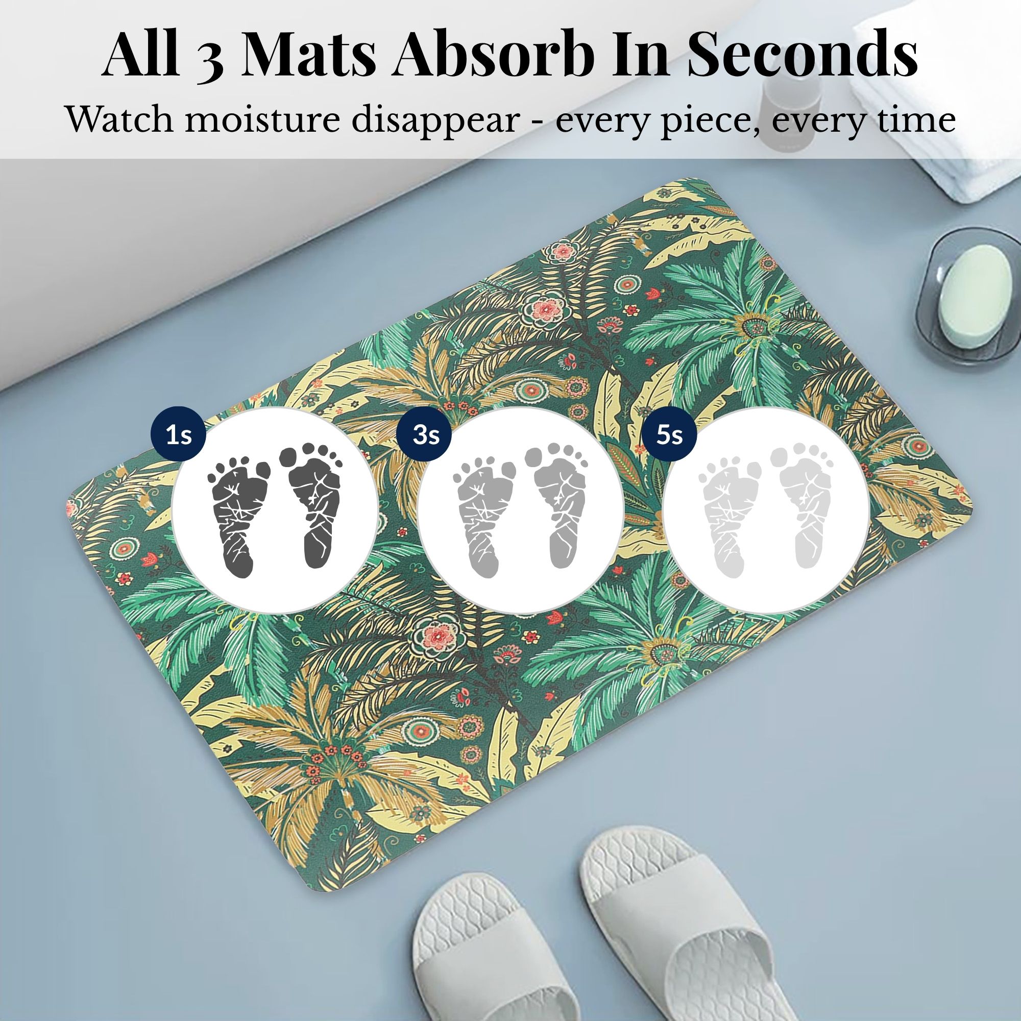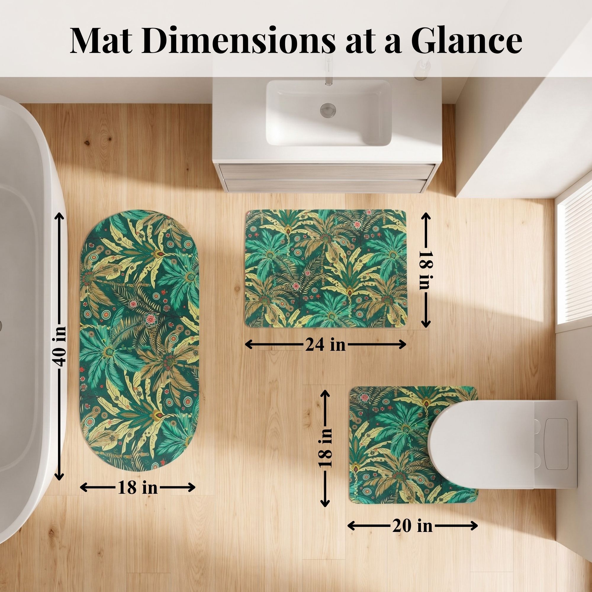 - MATCHING COLORFUL PRINT ACROSS ALL THREE: Same vivid Jungle Bloom design on every mat — a bold, nature-inspired statement throughout the bathroom