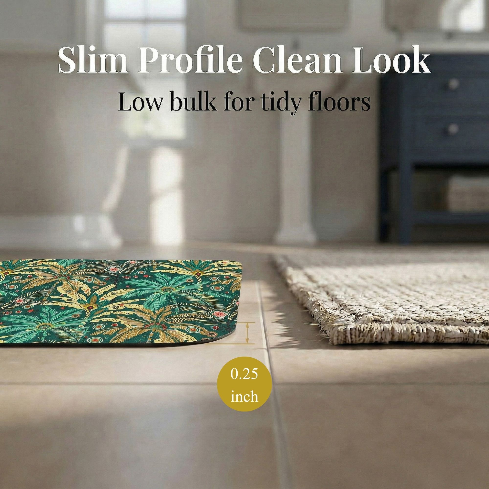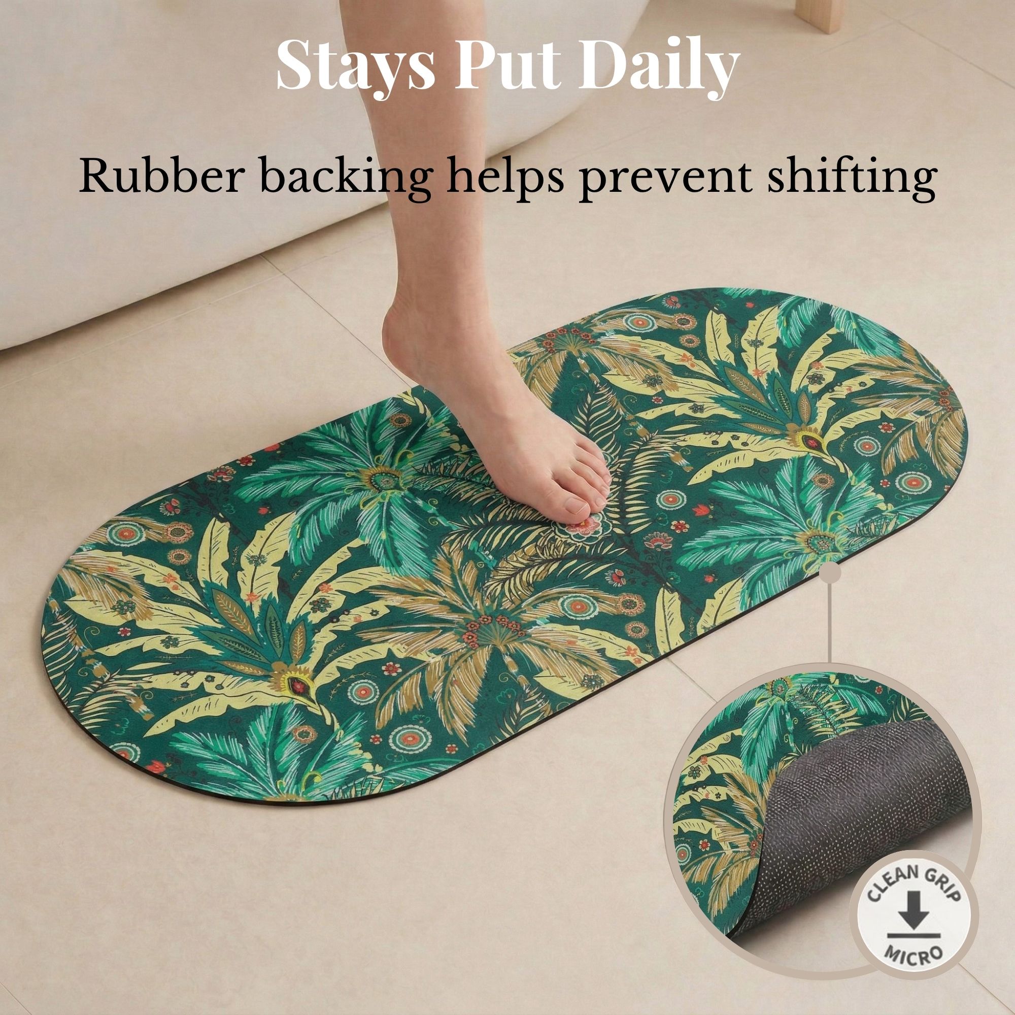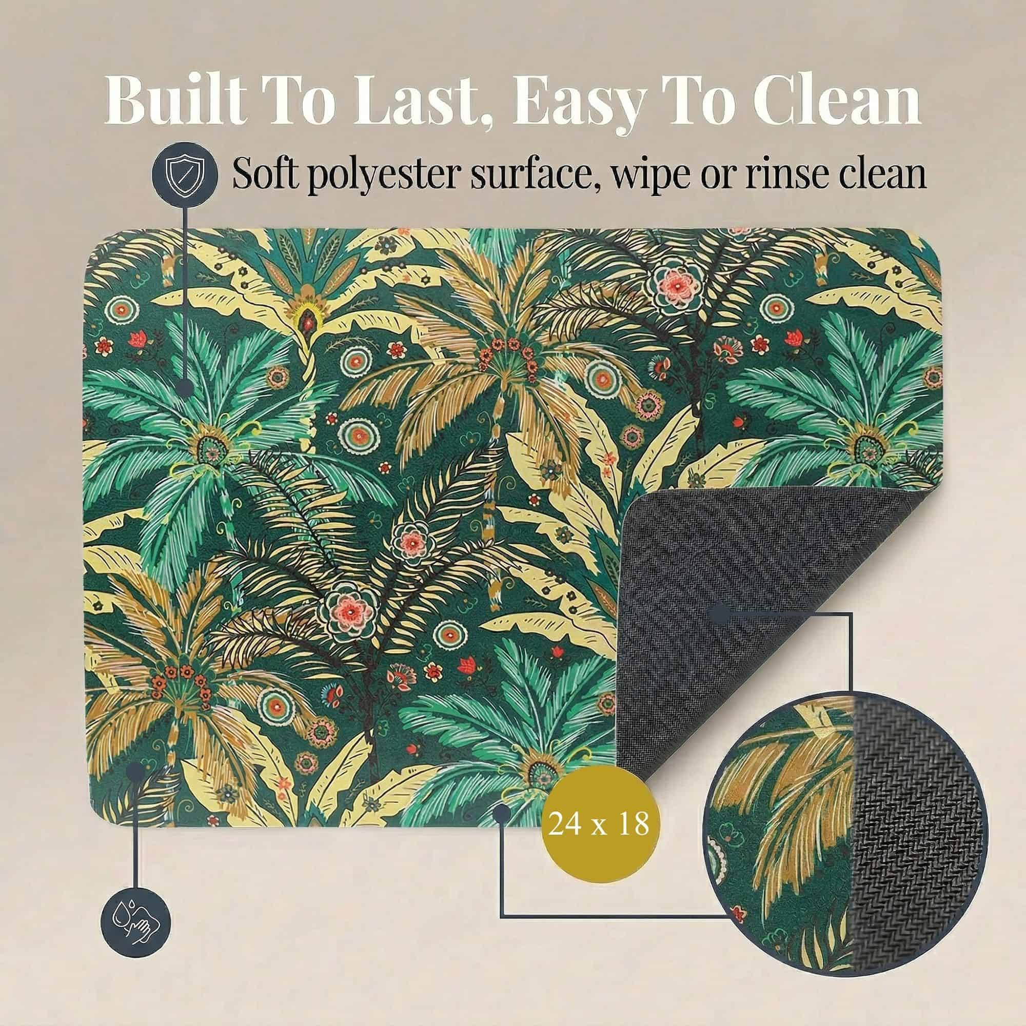 Every mat in the Jungle Bloom set shares the same high-performance construction: PU-Coated Polyester for fast absorption, a non-slip rubber backing that grips tile and vinyl, and machine-washable fabric that stays vibrant wash after wash.