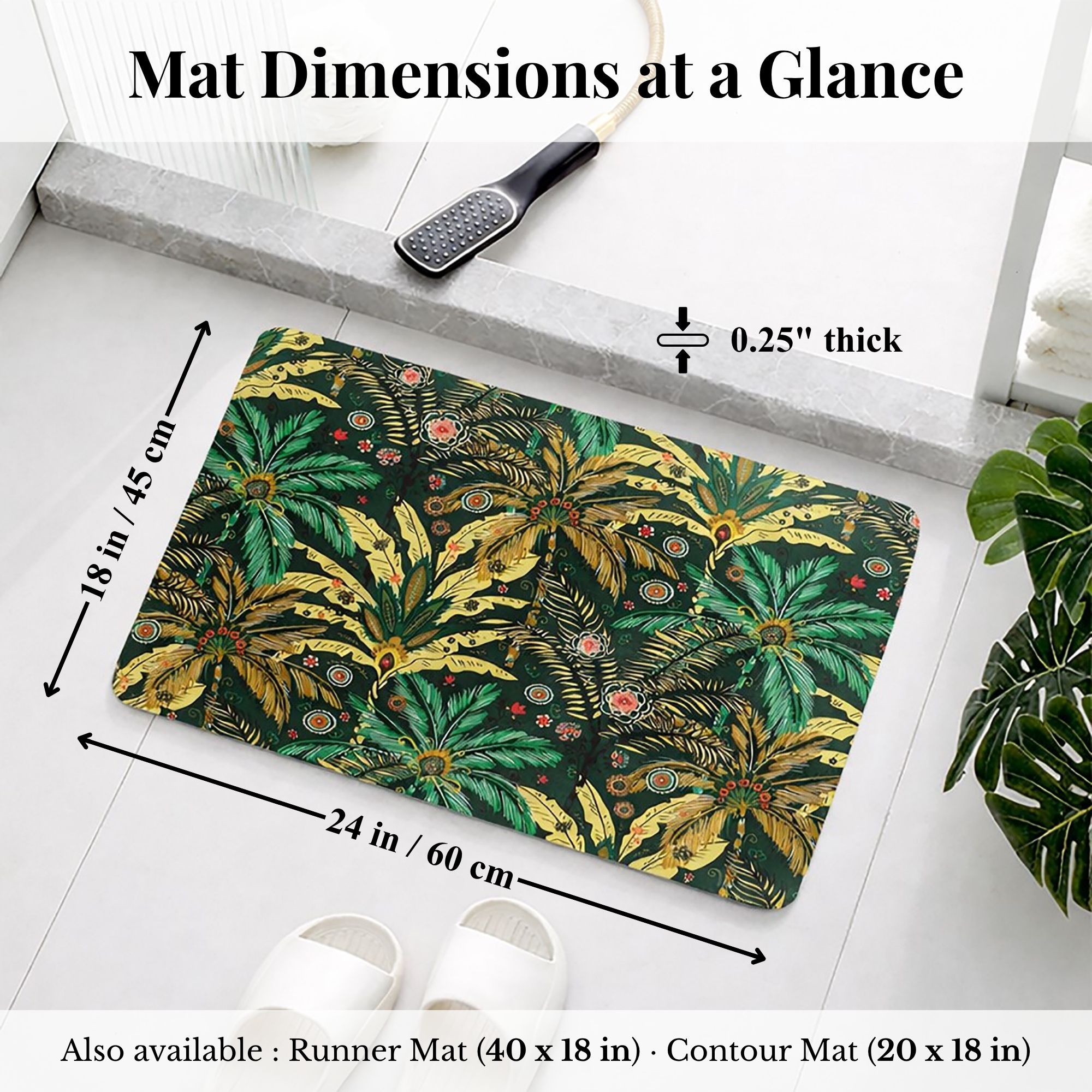 The Jungle Bloom Bath Mat is sized at 24 x 18 inches to fit most standard shower fronts, sink areas, and bathroom entry points. At 0.25 inches thick, it is lightweight and cushioned without blocking door movement.