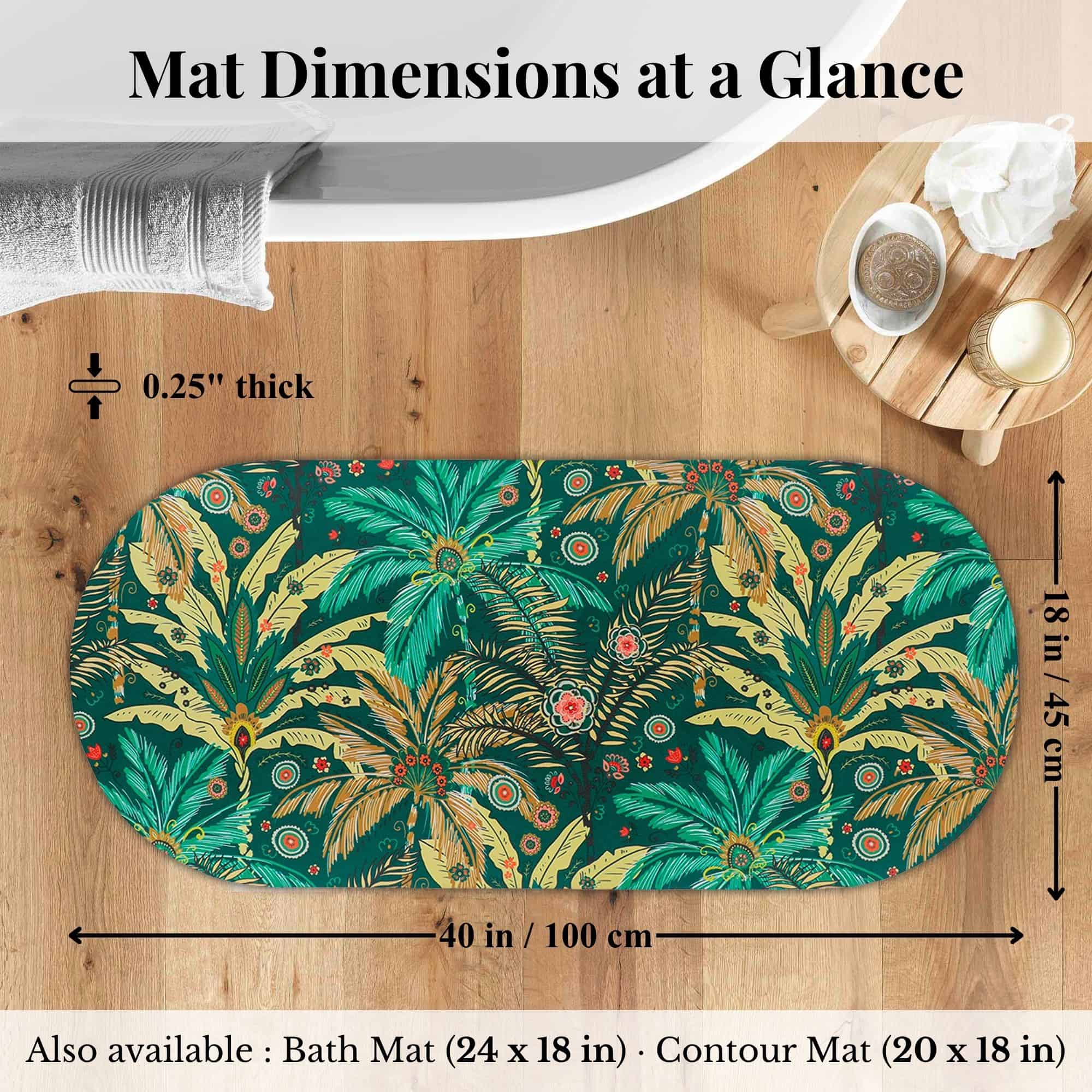 The Jungle Bloom Runner Bath Mat measures 40 x 18 inches — purpose-built to span bathtub fronts, double vanities, or wide shower entries. At 0.25 inches thick, it lies flat and secure without creating a tripping hazard.
