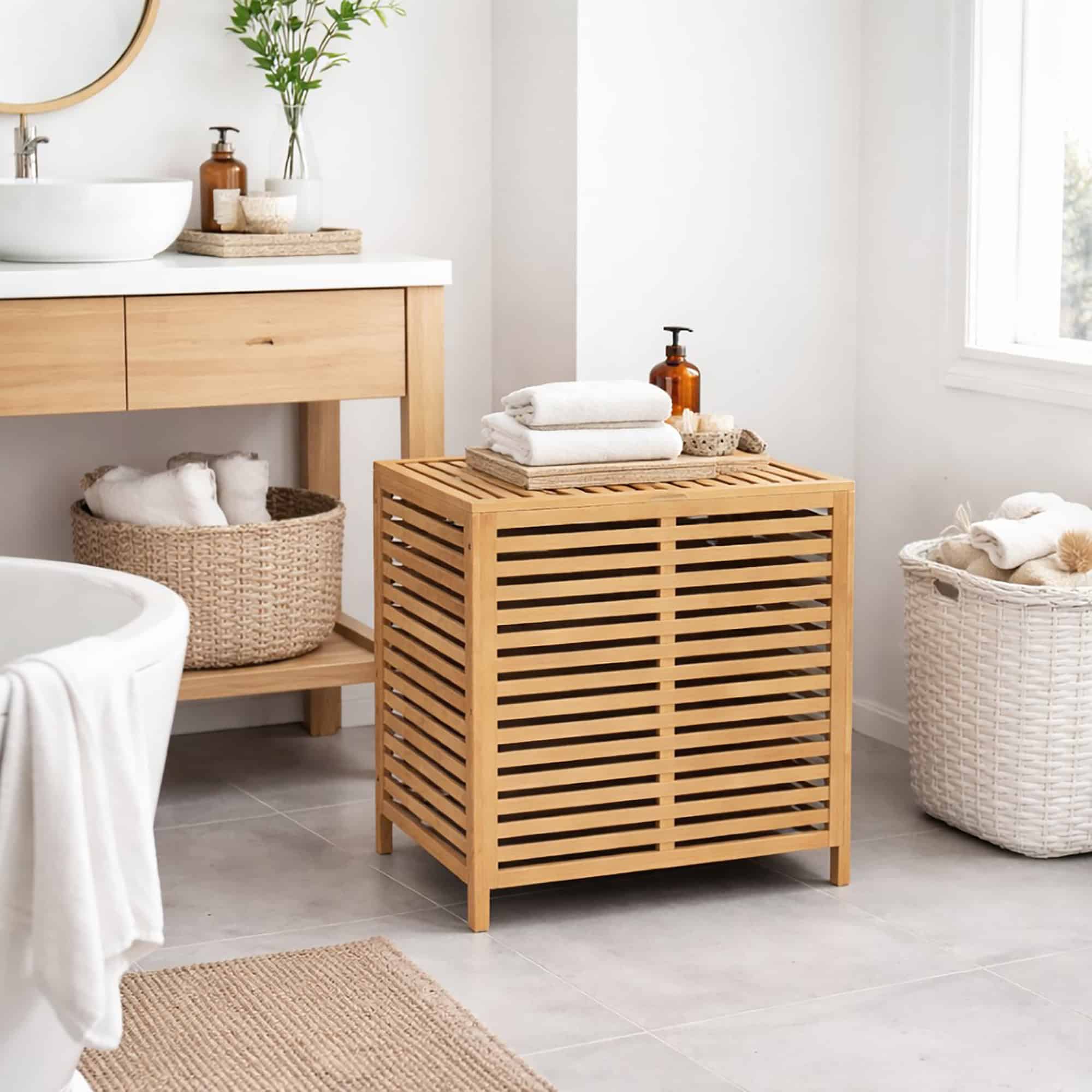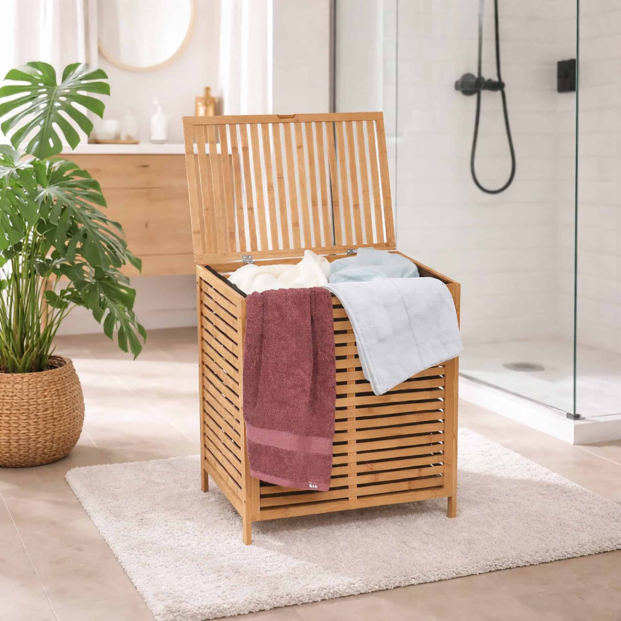 - SLEEK AND VERSATILE DESIGN: The natural bamboo finish of this large laundry hamper complements any decor, fitting seamlessly into bathrooms, bedrooms or laundry spaces