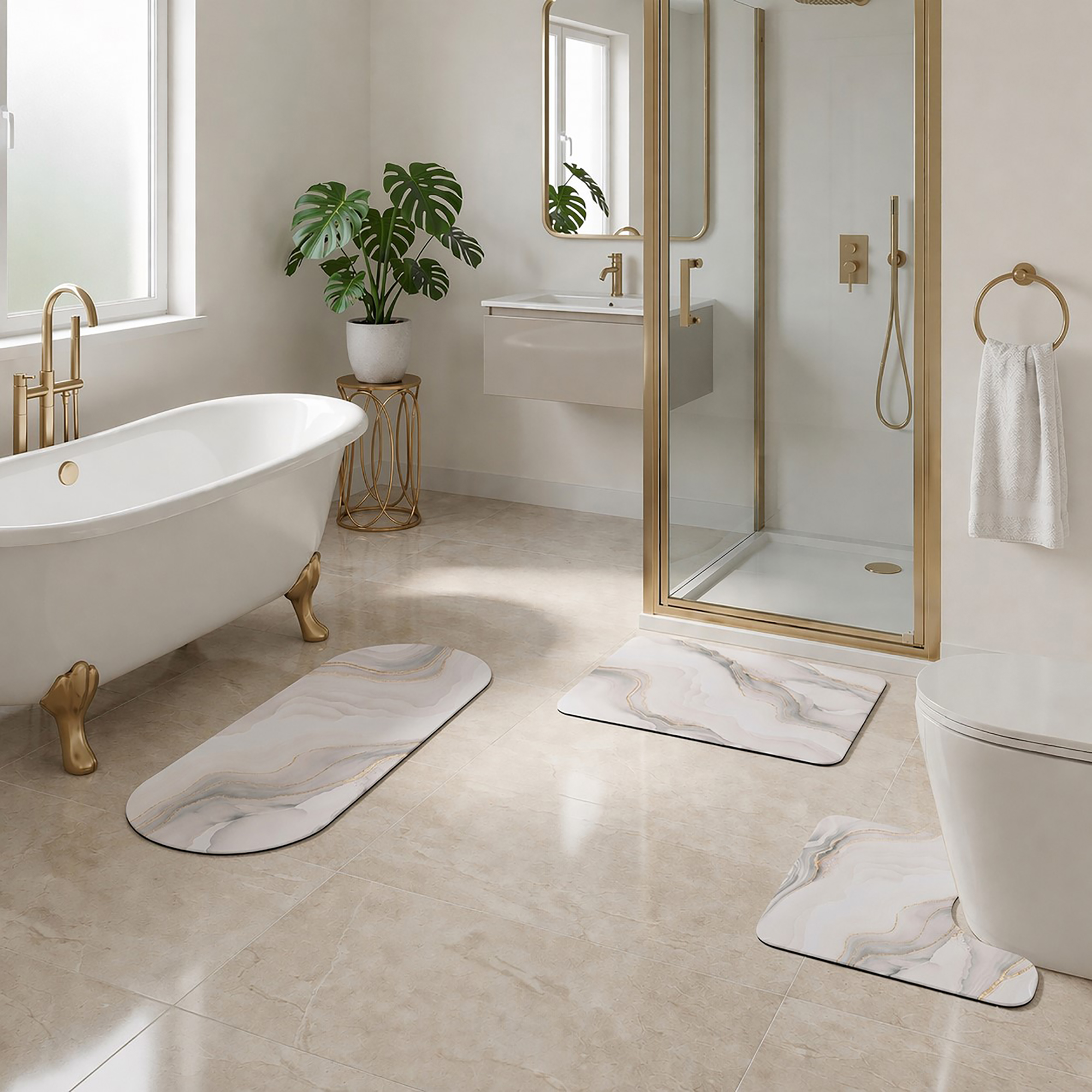 The Marble Vein Luxury Bath Mat Bundle transforms the entire bathroom floor with a sophisticated beige, gold, and gray marble-veining print across all three coordinated mats. Whether it’s a master en-suite, a guest bathroom, or a boutique rental, the complete set creates polished, hotel-quality presentation in one purchase. PU-coated polyester and rubber anti-slip bases deliver everyday durability behind the luxury look.