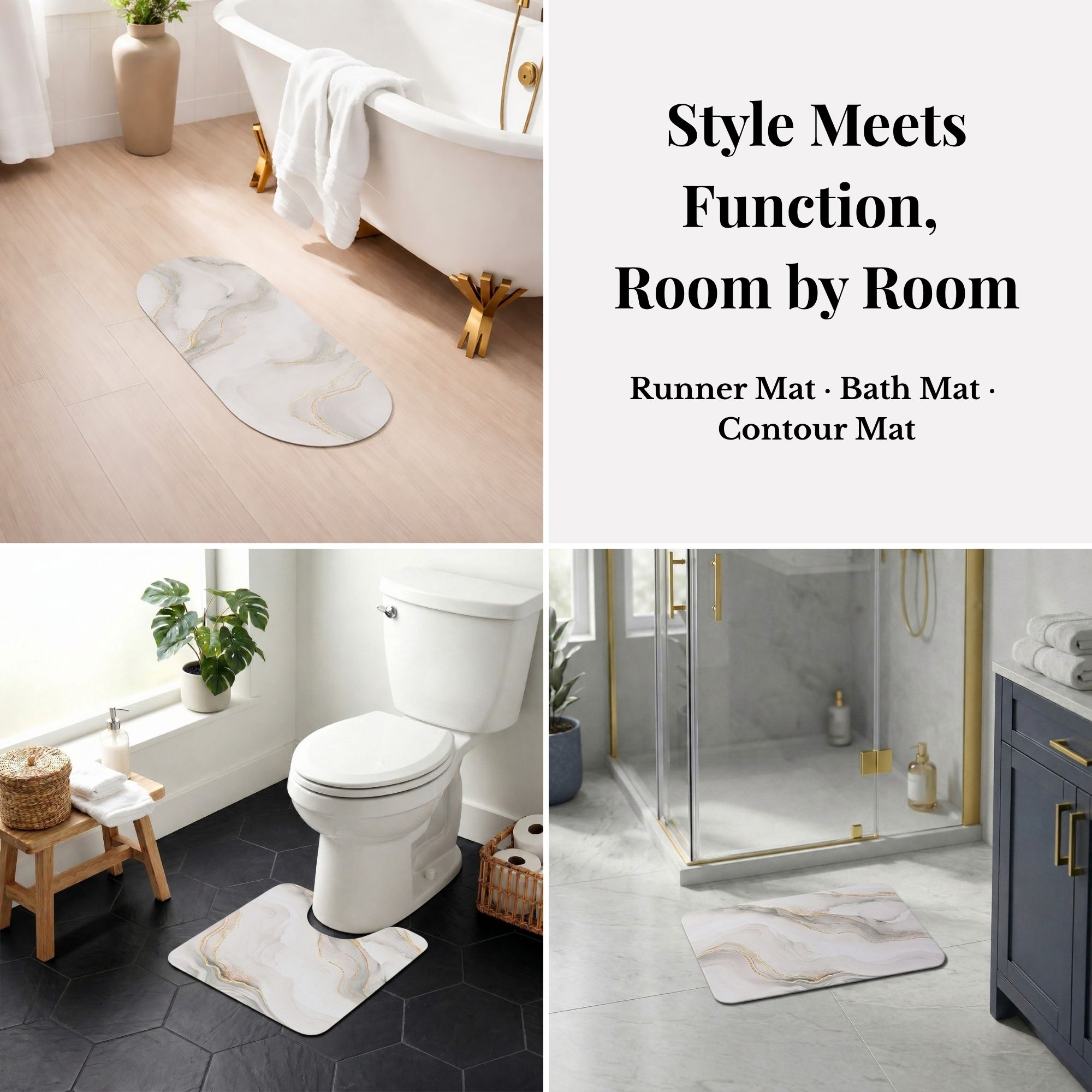 - ELEGANT MARBLE-PRINT BATH MAT BUNDLE: Three Marble Vein mats — Standard (24×18), Runner (40×18), and Contour (20×18) — in coordinated beige, gold, and gray for a complete upscale bathroom presentation