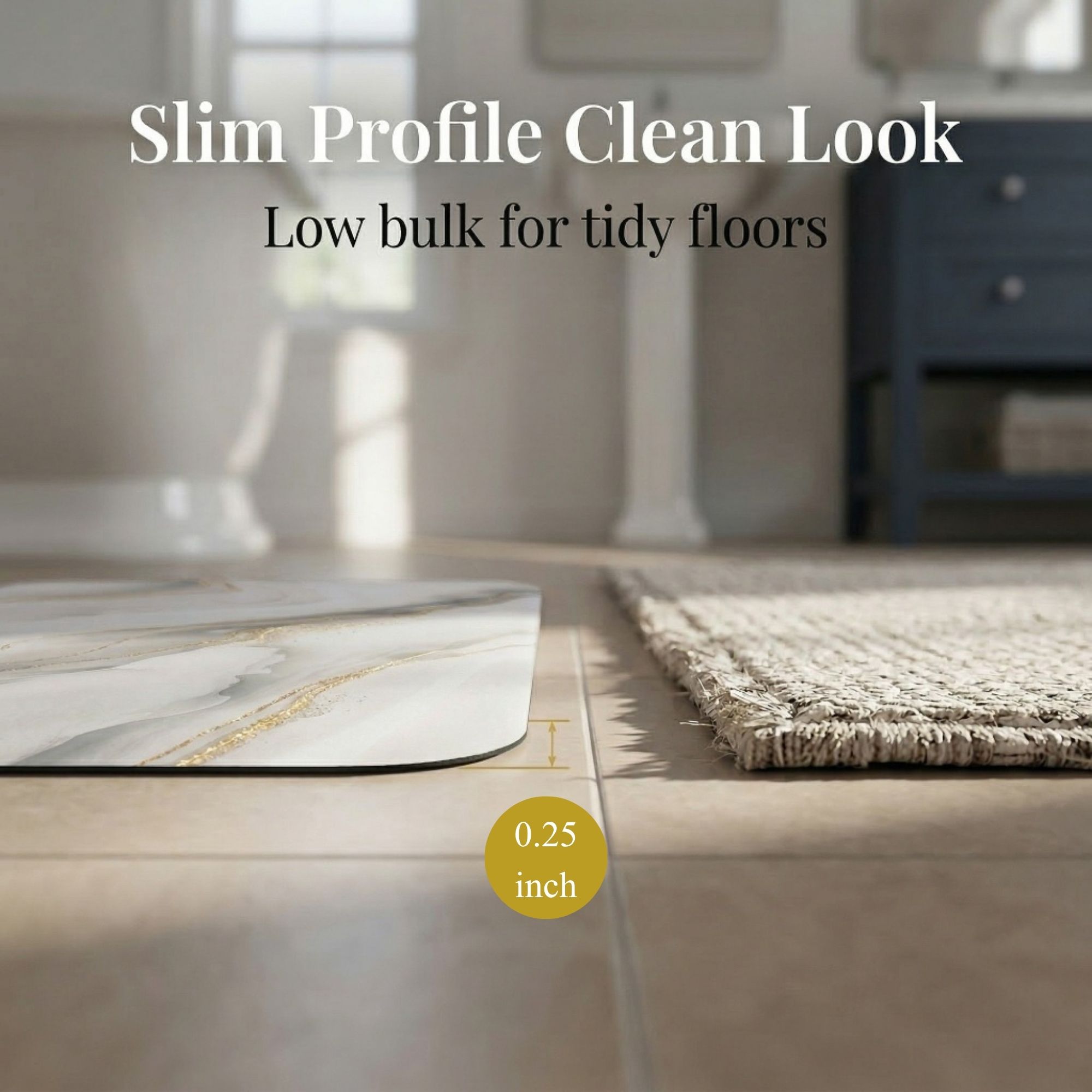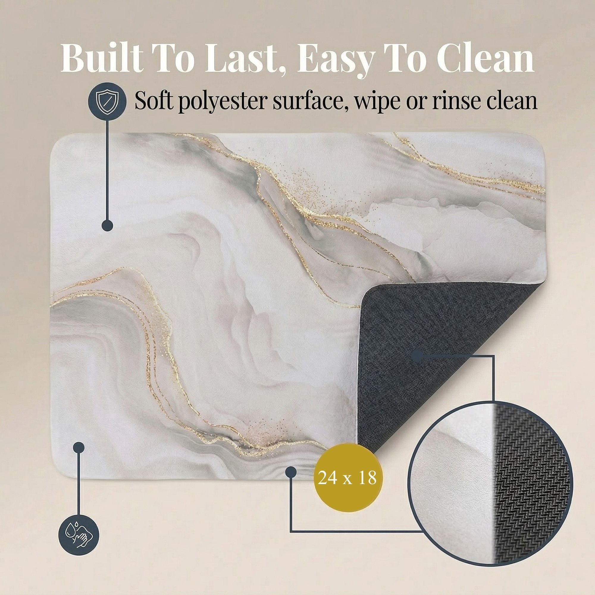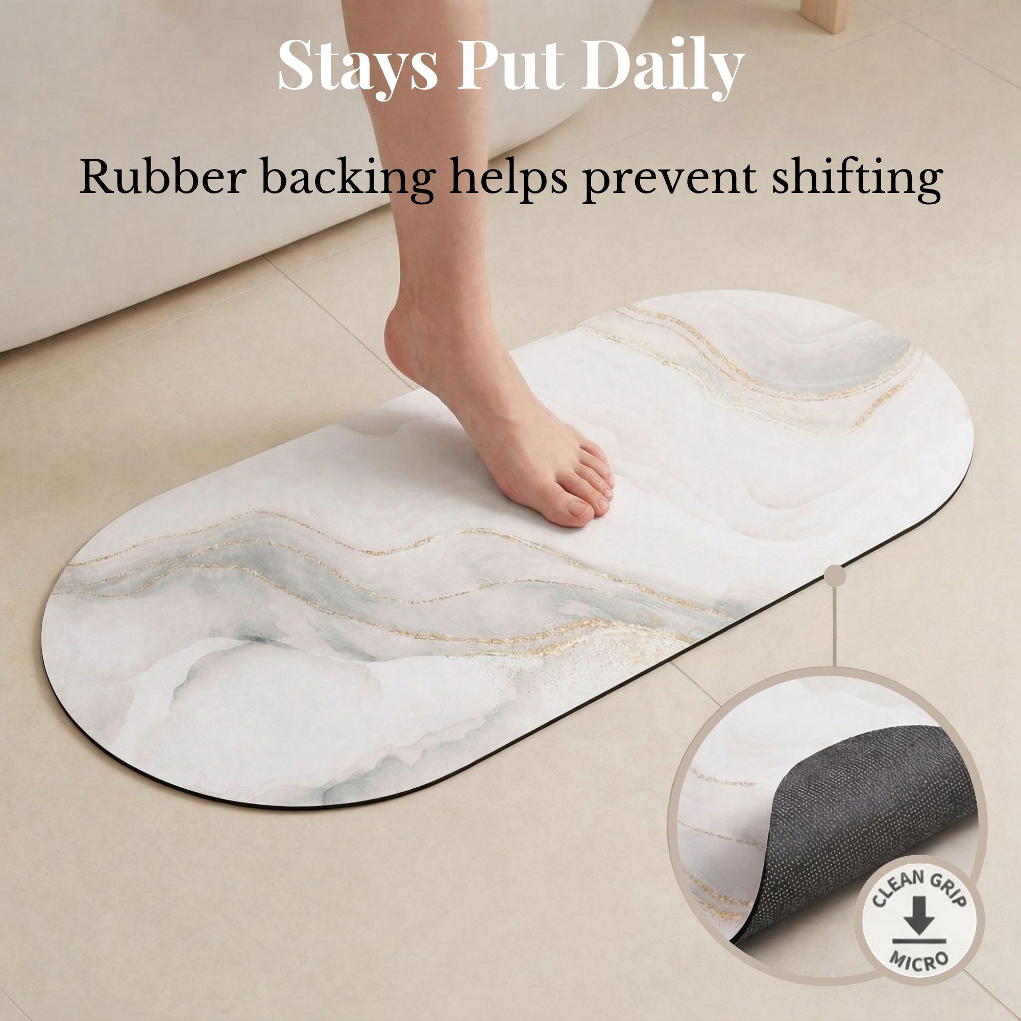 Every mat in the Marble Vein set shares the same high-performance construction: PU-Coated Polyester for fast absorption, a non-slip rubber backing that grips tile and vinyl, and machine-washable fabric that stays vibrant wash after wash.