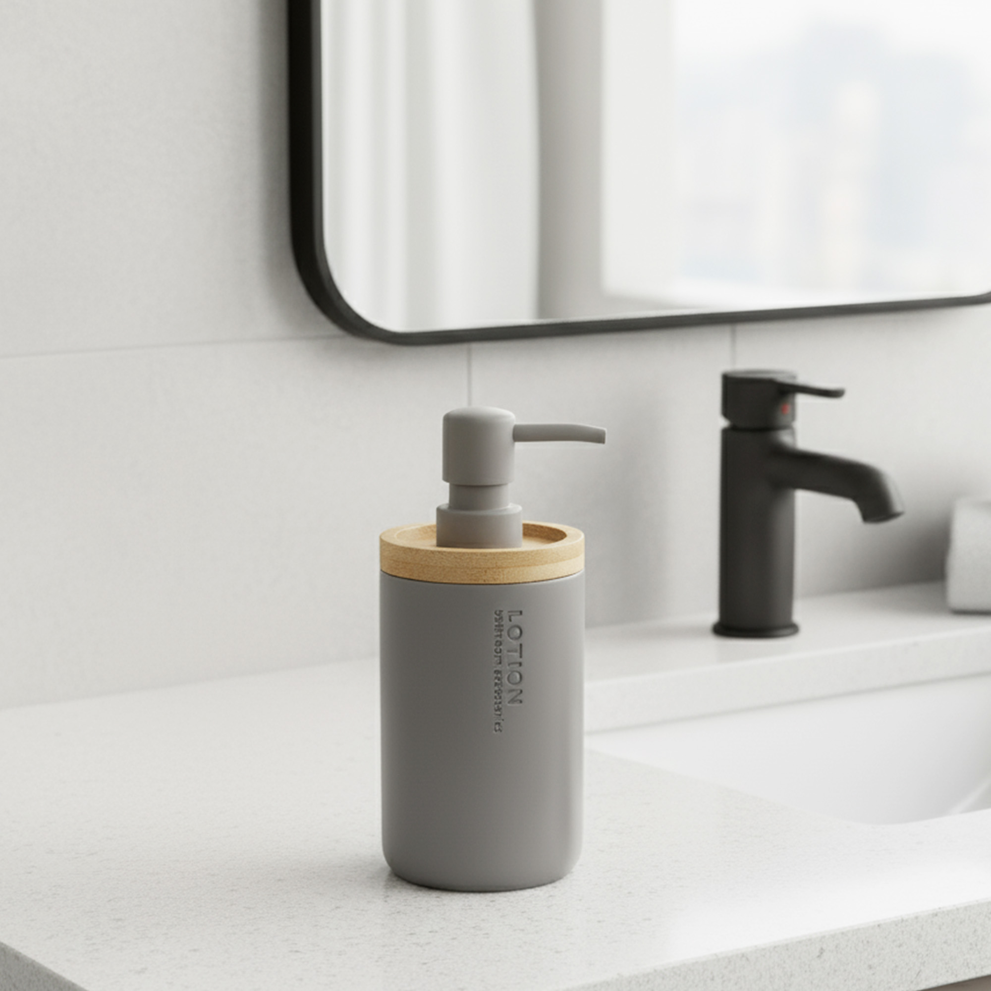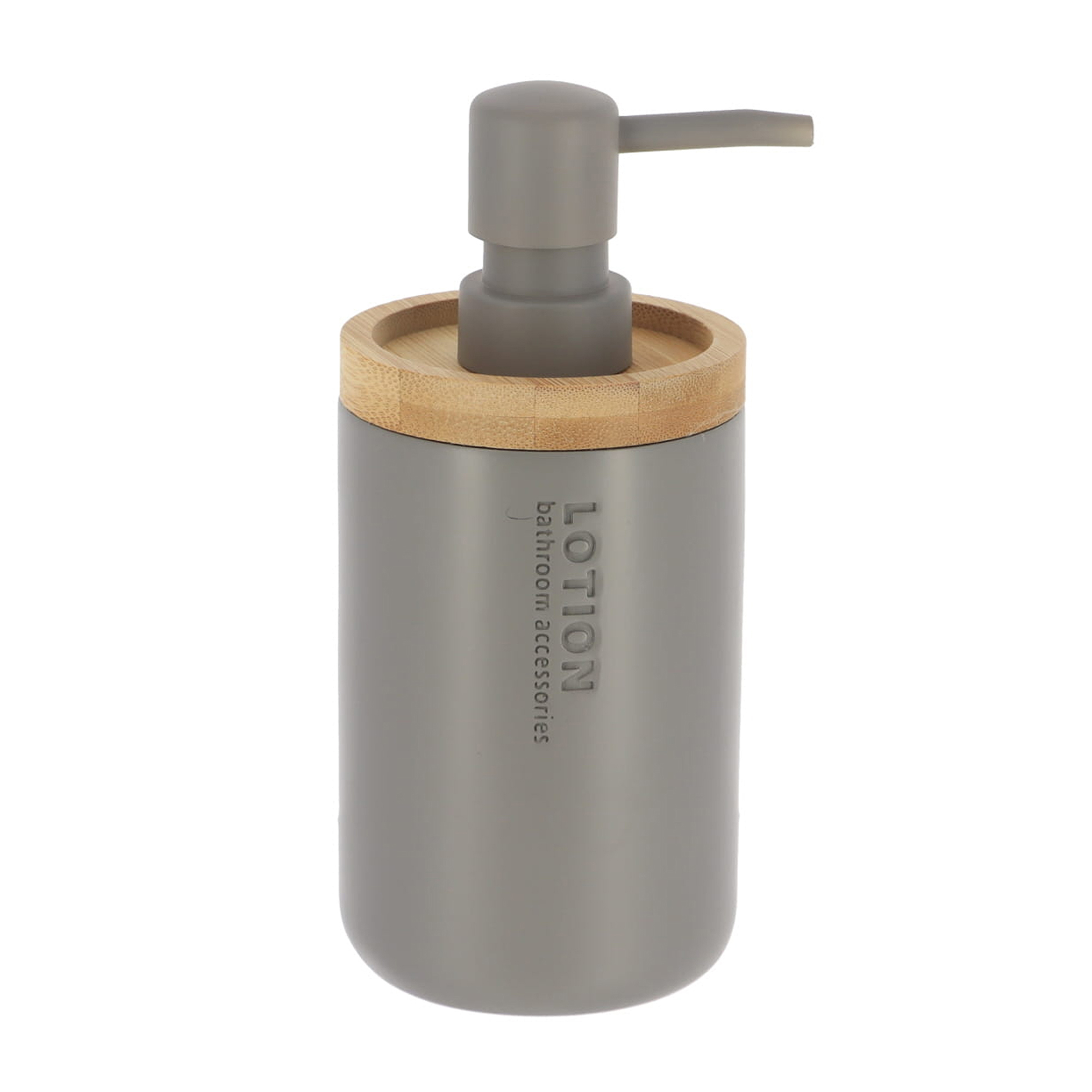 Modern Matte Gray Soap Dispenser with Natural Bamboo Accent – Polyresin Hand Lotion Pump, Contemporary Bathroom Accessory