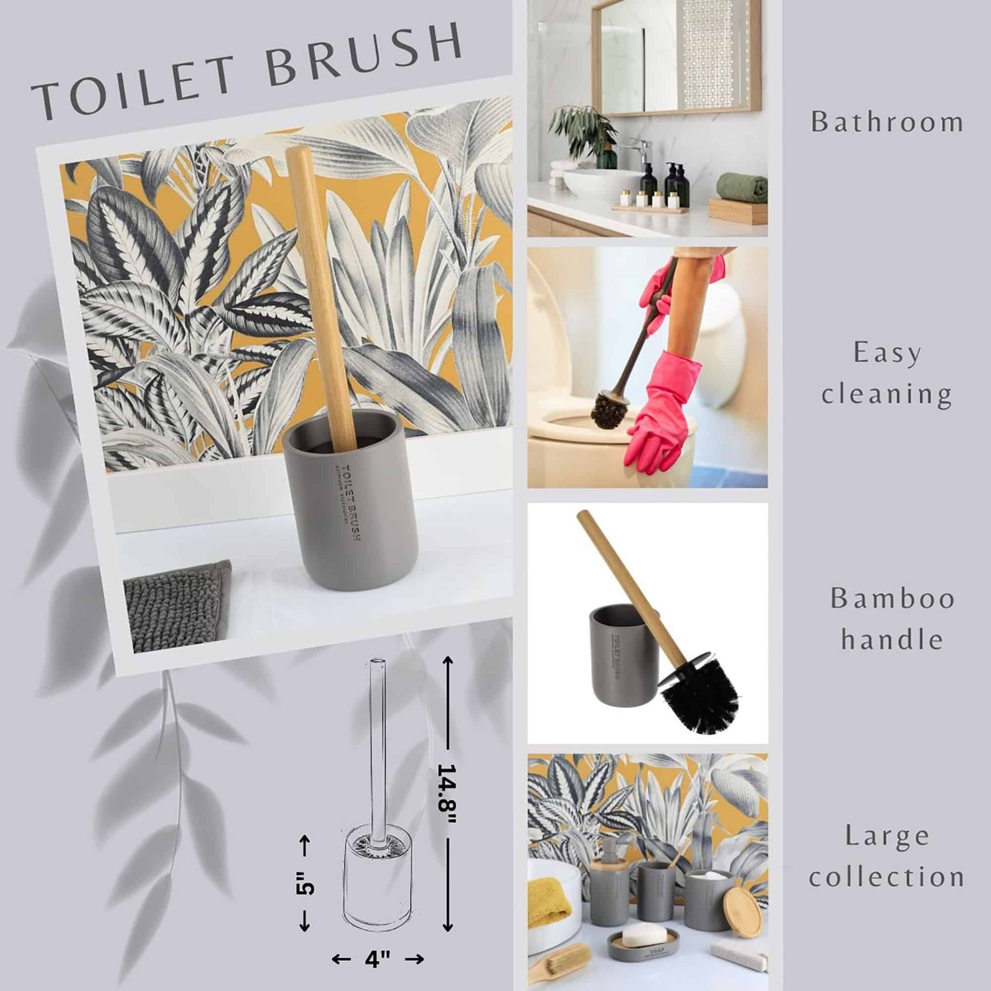 - COMPACT AND PRACTICAL: Designed to save space, this toilet brush fits perfectly into any bathroom, adding elegance without taking up too much room. Dimensions: 14.8”H x 4”L x 4”W