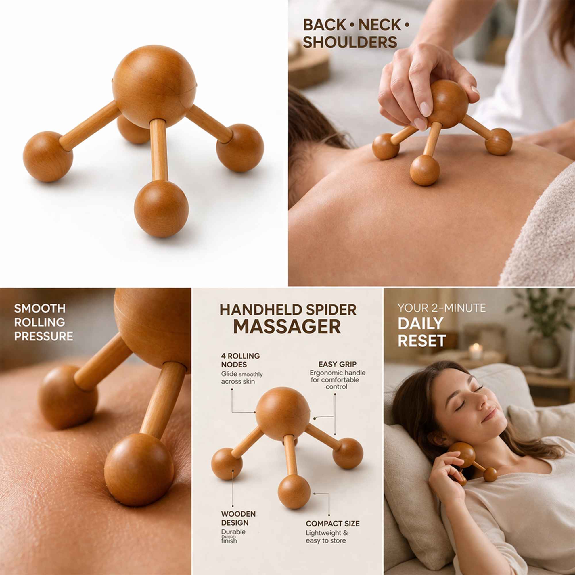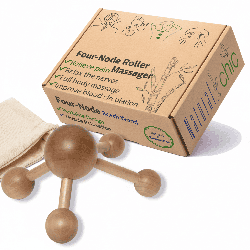 Crafted from 100% sustainable beech wood, this compact massage tool combines nature-inspired design with functional comfort. Its four rounded nodes provide deep, even pressure to soothe sore areas and promote better circulation — perfect after workouts, long office hours, or daily routines.