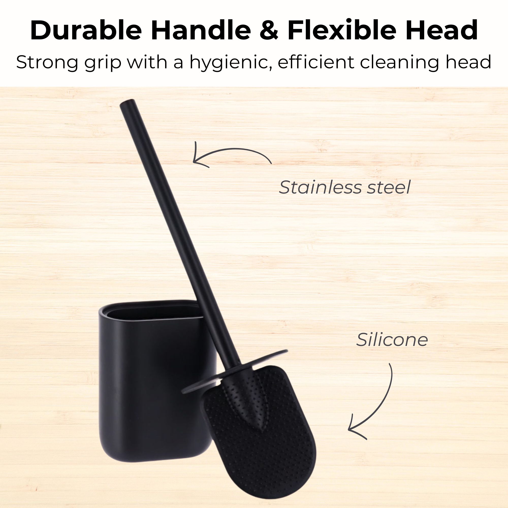 Firstly, the slim oval base fits neatly beside any toilet without taking extra floor space. Additionally, the weighted polyresin toilet brush holder keeps the brush upright and stable on every surface. Moreover, the stainless steel handle provides a strong grip and long-lasting durability. Meanwhile, the silicone brush head resists buildup and rinses easily for hygienic cleaning. Furthermore, the moisture-resistant material ensures the toilet brush set remains fresh and easy to maintain.