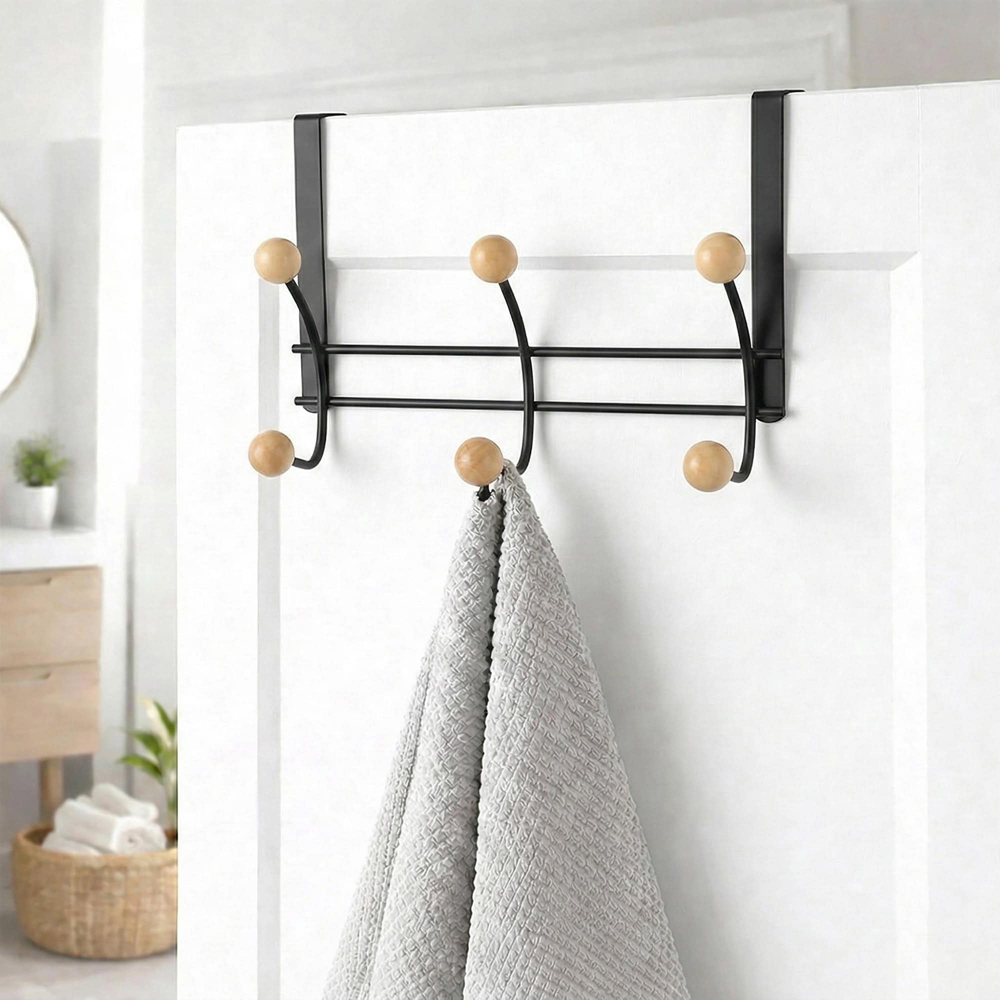 Over The Door Hook Rack Black Finish with 6 Natural Wooden Ball Ends