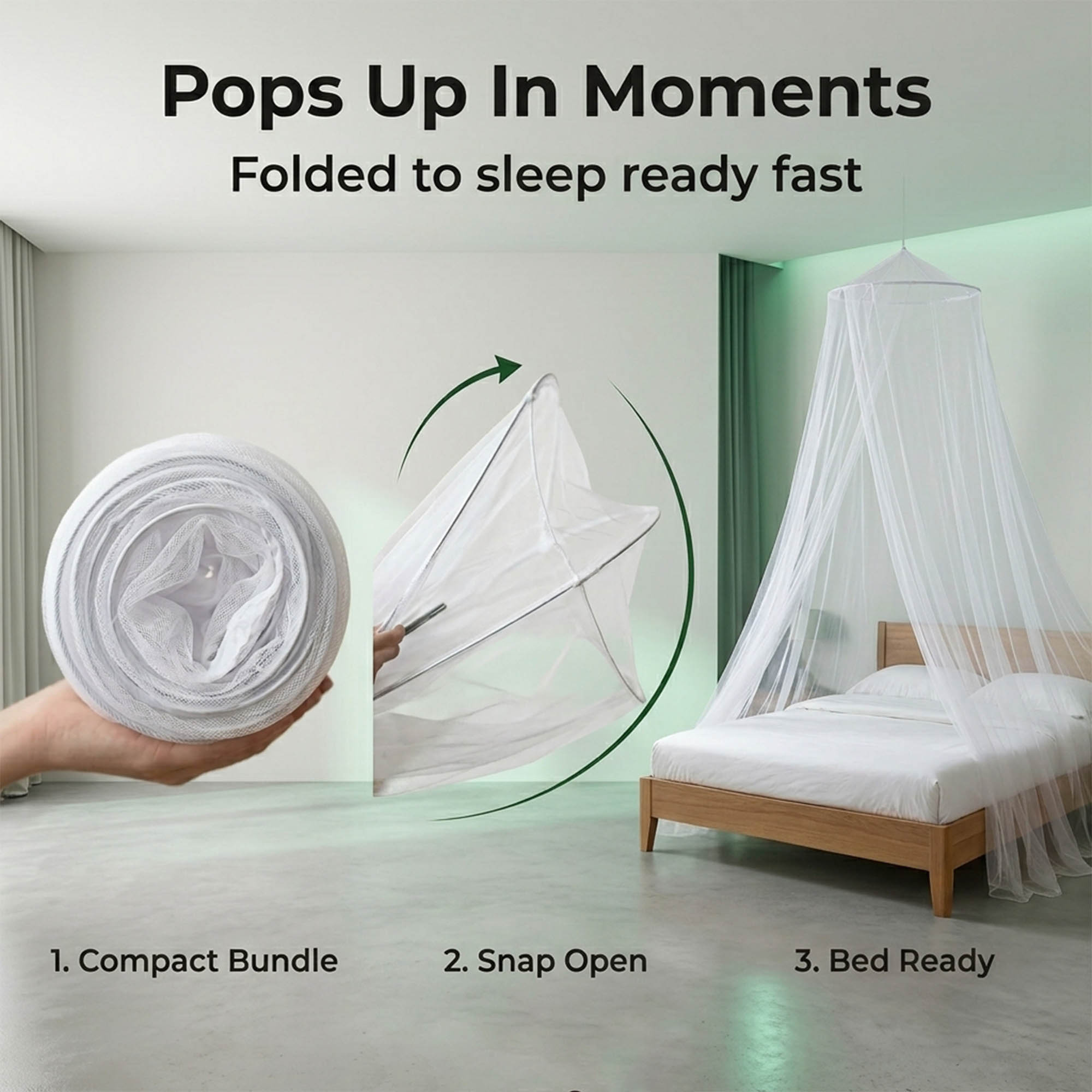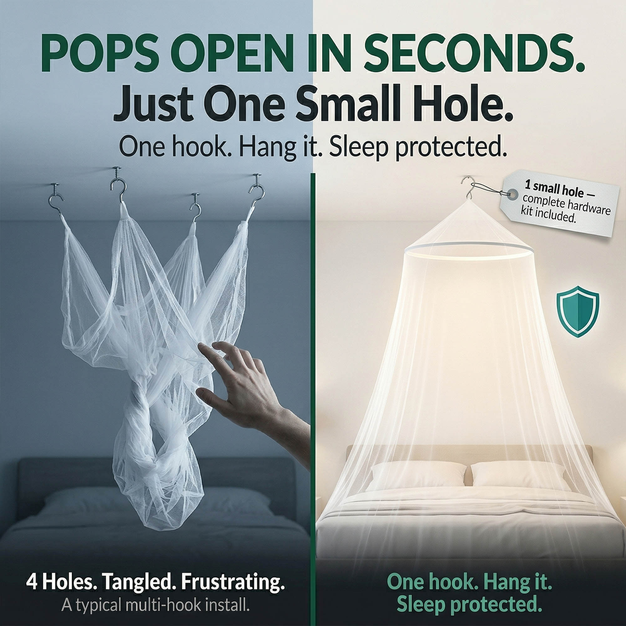 - POPS OPEN IN SECONDS: Spring-loaded hoop expands automatically the moment you remove it from the box. No tools, no assembly, no frustration. Hang from the single included ceiling hook and your bed is protected tonight.