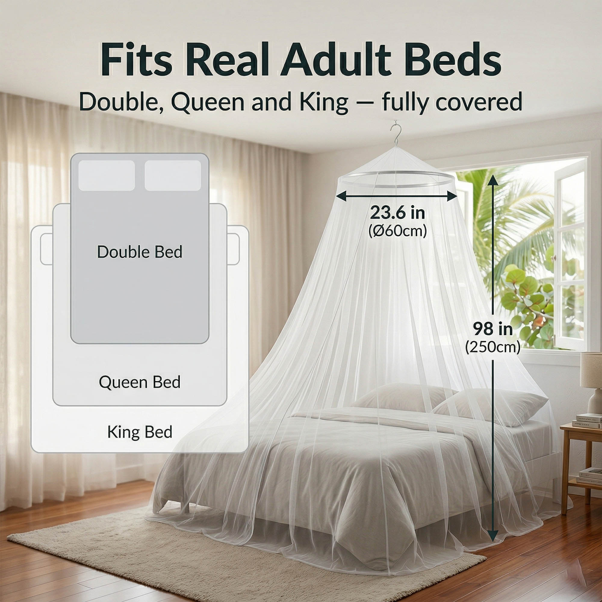- FITS DOUBLE, QUEEN AND KING BEDS — 23.6 in (Ø60cm) hoop, 98 in (250cm) drop. Full enclosure to mattress level. No gaps.