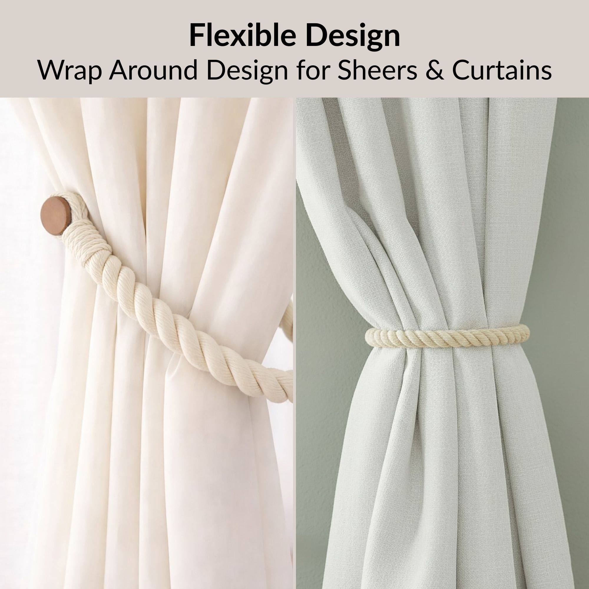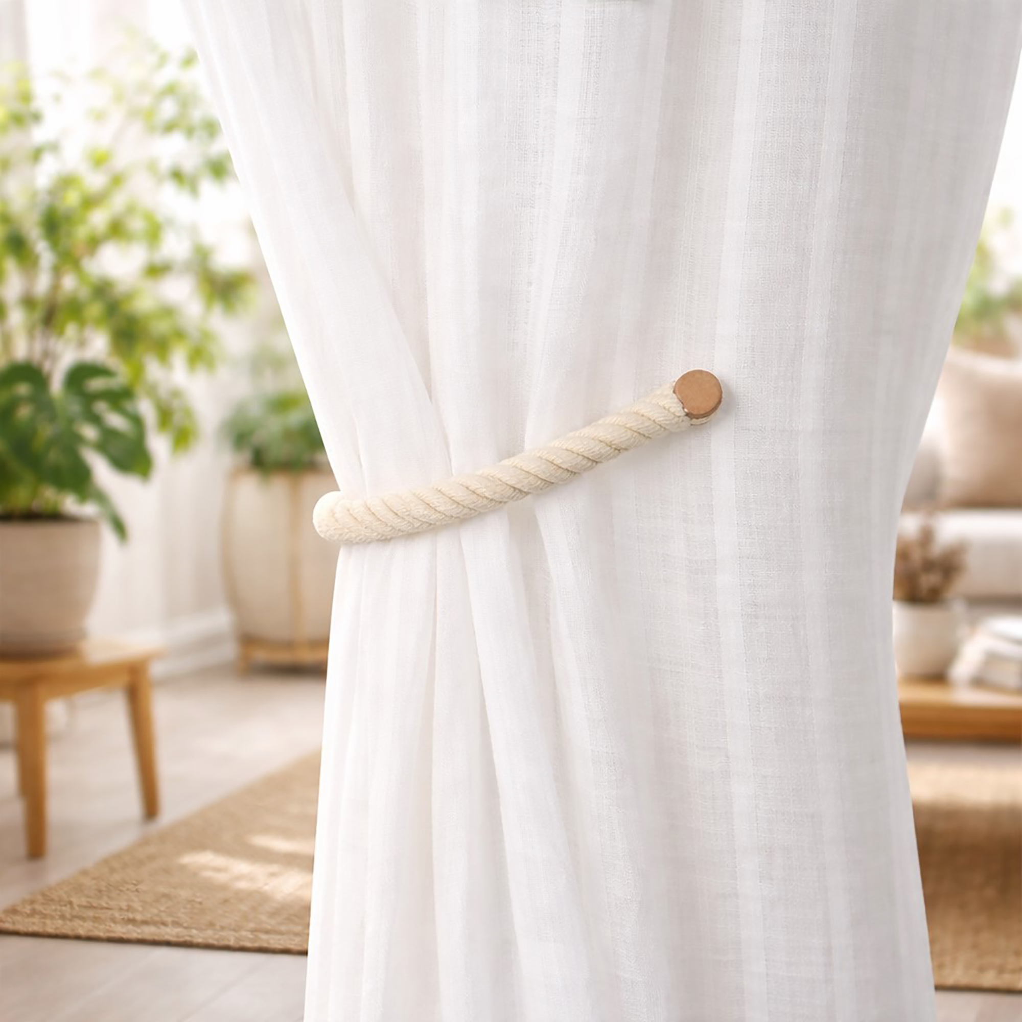 Instead of wall-mounted hooks, each curtain tieback uses a flexible wrap around design with integrated magnetic ends. First, gather the curtain at your desired height. Then, wrap the twisted rope around the fabric and connect the wooden ends to secure the panel in place. As a result, curtains stay neatly arranged without creasing or permanent marks.