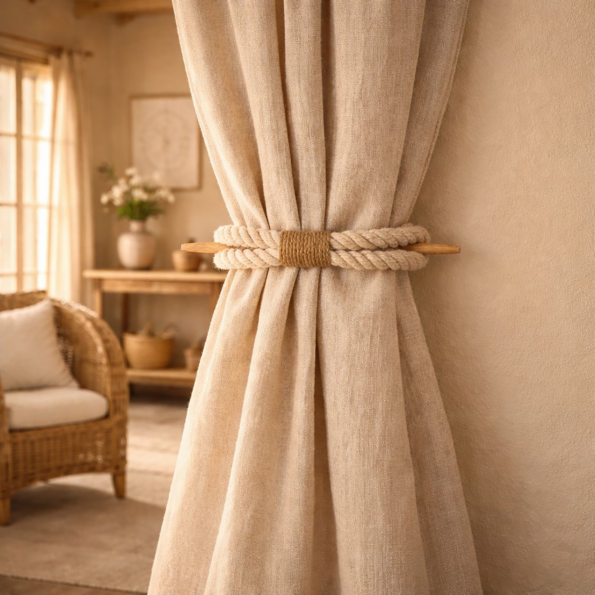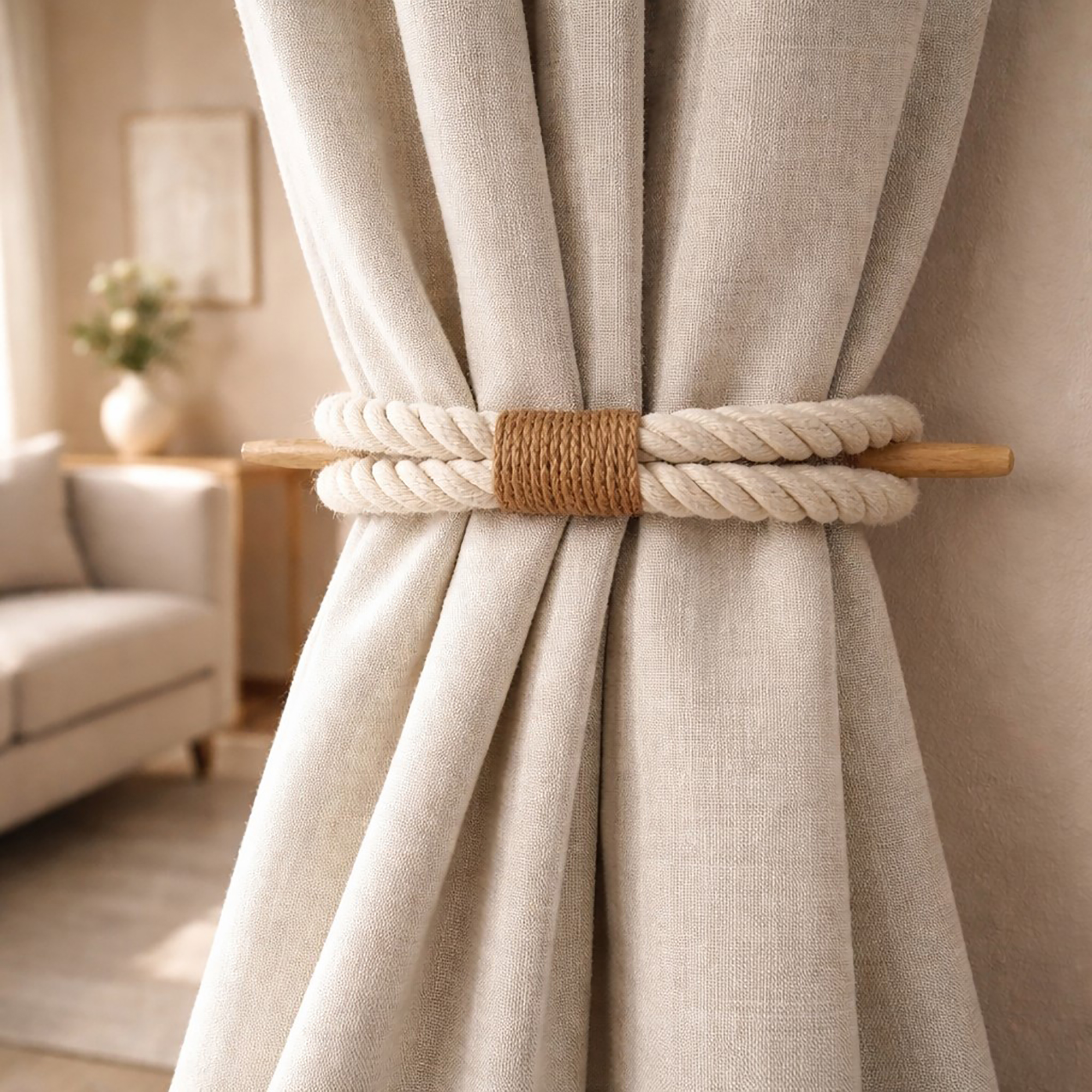 In addition, the twisted cotton rope adds a soft textured appearance, while the natural wood rod provides a warm, balanced finish. The ecru cotton color pairs naturally with light, neutral, and warm interior spaces. It makes this set of curtain ties suitable for living rooms, bedrooms, or reading areas. Overall, these curtain holders deliver a clean, tool-free solution for holding curtains evenly on both sides of a window.