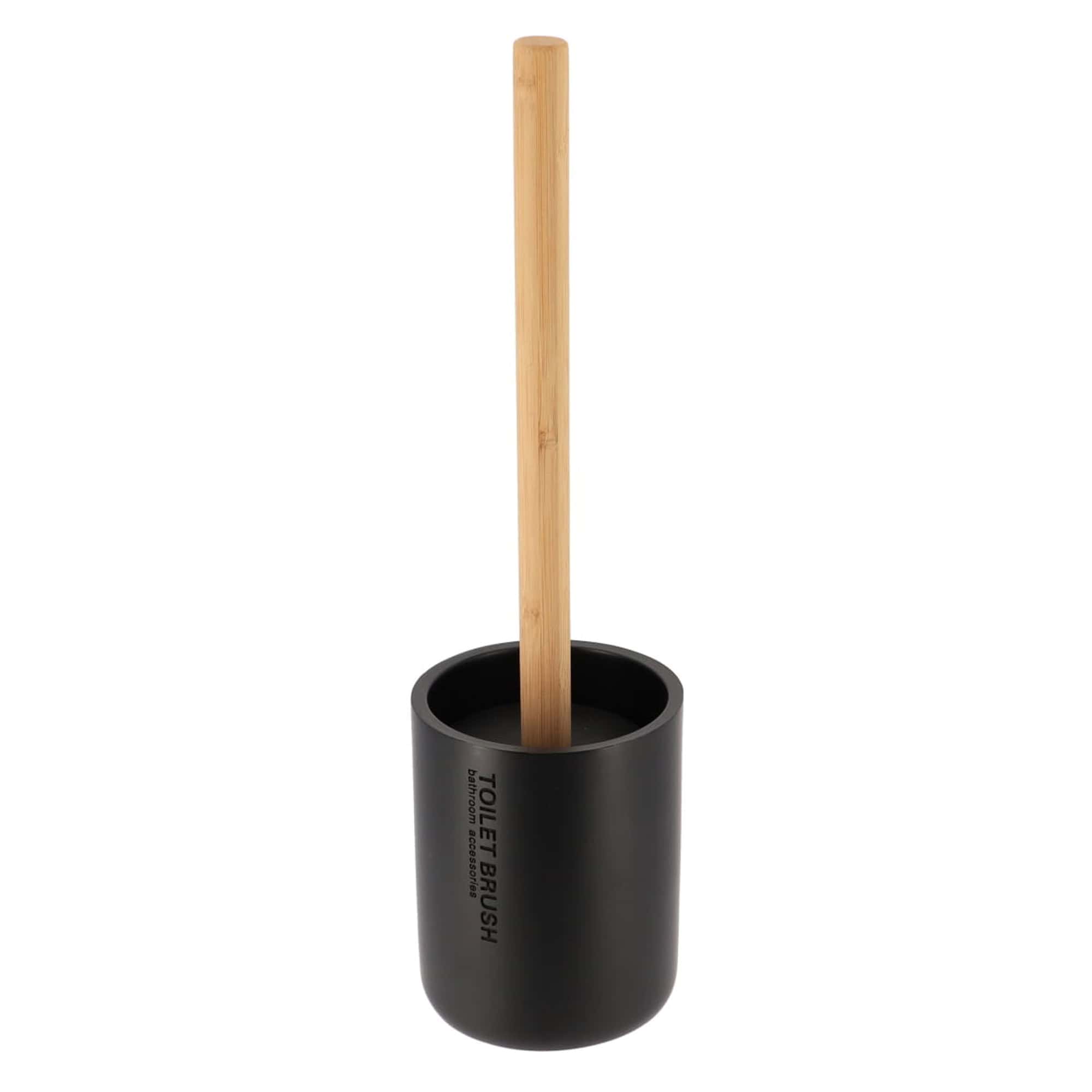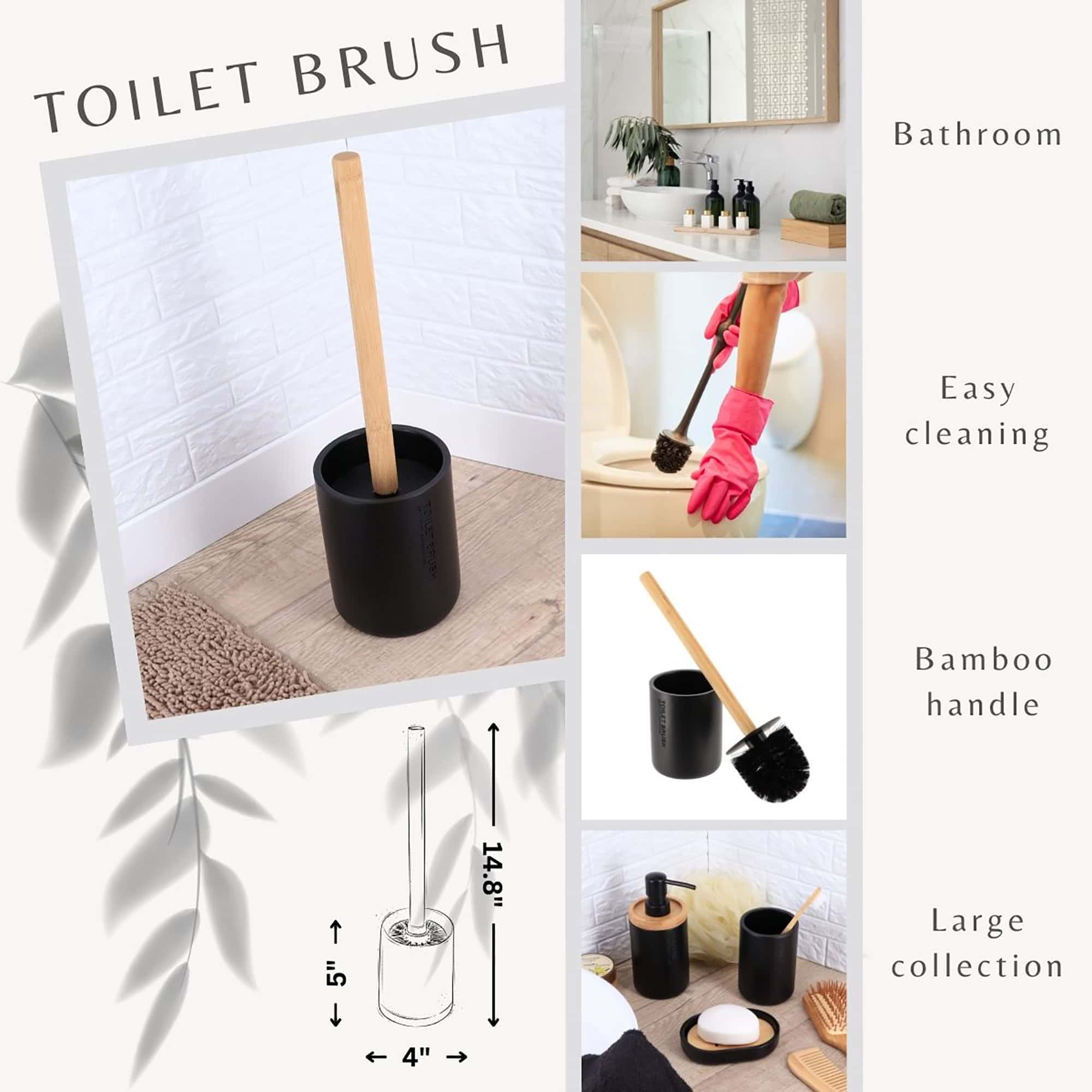 Sleek Matte Black Toilet Brush Holder with Bamboo Handle – Polyresin Bathroom Cleaning Tool Set